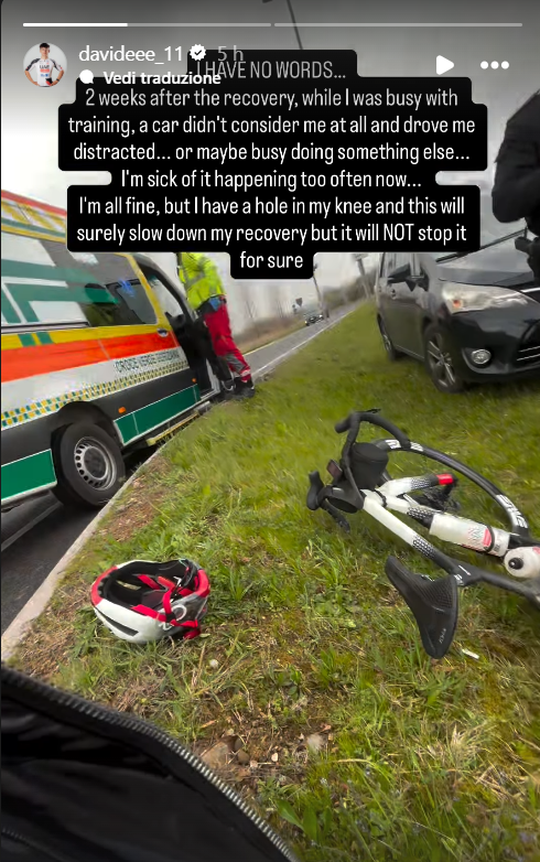 La dinamica dell’incidente è stata raccontata dallo stesso Stella, che ha condiviso sui social un video mentre si trovava a terra dopo l’impatto, corredato dalla spiegazione di quanto avvenuto: “Non ho parole…due settimane dopo il recupero, mentre ero impegnato in allenamento, un’auto non mi proprio considerato e mi ha investito, perché era distratto o forse impegnato a fare altro. Sono stufo che queste cose capitino troppo spesso ora. Sto bene, ma ho una ferita al ginocchio e questo sicuramente rallenterà il mio recupero, ma certamente non lo fermerà”. Il corridore ha poi condiviso anche un’immagine dall’ospedale, da cui riparte il recupero in questo periodo davvero sfortunato.