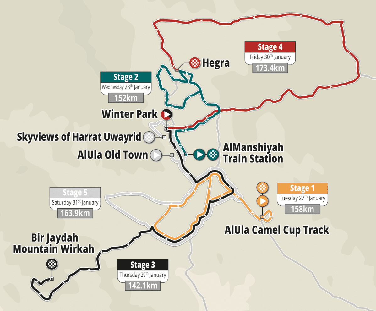 Percorso classico per l’AlUla Tour 2026. La gara a tappe che si svolgerà in Arabia Saudita dal 27 al 31 gennaio 2026 si snoderà con la consueta formula delle cinque frazioni nella zona nord-occidentale dello stato medio-orientale. Le località di partenza e di arrivo delle giornate di gara sono ormai abituali, anche se gli organizzatori hanno voluto ricombinare le tipologie di tappa rispetto al recente passato, con gli arrivi che si annunciano più selettivi, quelli di Bir Jaydah Mountain Wirkah e delle Skyviews of Harrat Uwayrid, posizionati al terzo e al quinto (e ultimo) giorno e quelli più veloci che andranno in scena in occasione della prima, della seconda e della quarta frazione. Le sorti della corsa saudita, che proprio quest’anno sale di categoria diventando UCI 2.Pro, saranno quindi probabilmente aperte fino all’ultimo chilometro.