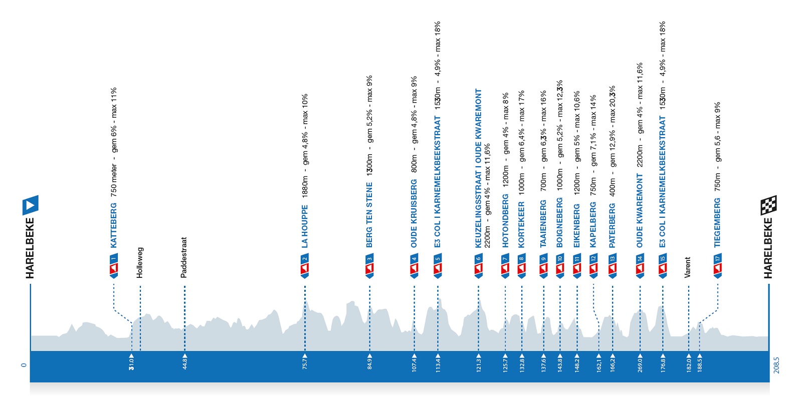 Si parte come al solito con il Katterberg dopo poco più di 30 chilometri, poi a 133 km dall’arrivo inizia la sequenza con La Houppe, per poi arrivare alla variazione di tracciato, con Berg ten Stene e Oude Kruisberg ad anticipare il primo passaggio sull’E3-Col e sul Vecchio Kwaremont, nell’inedito passaggio dal Keuzelingstraat, muro privo di pavé. Dal successivo Hotondberg, riprende la sequenza tradizionale, con il momento clou del passaggio Paterberg-Vecchio Kwaremont fino al Tiegemberg, ultimo muro a 19 chilometri dal traguardo.