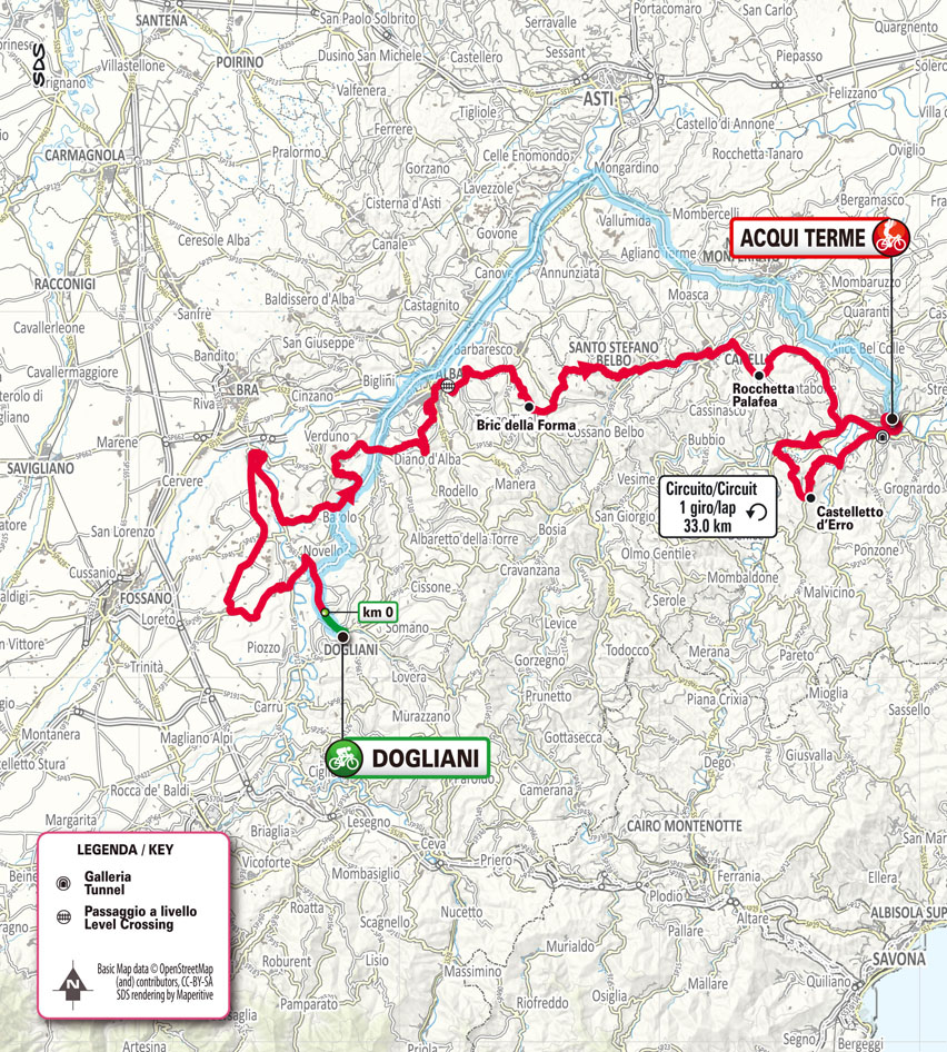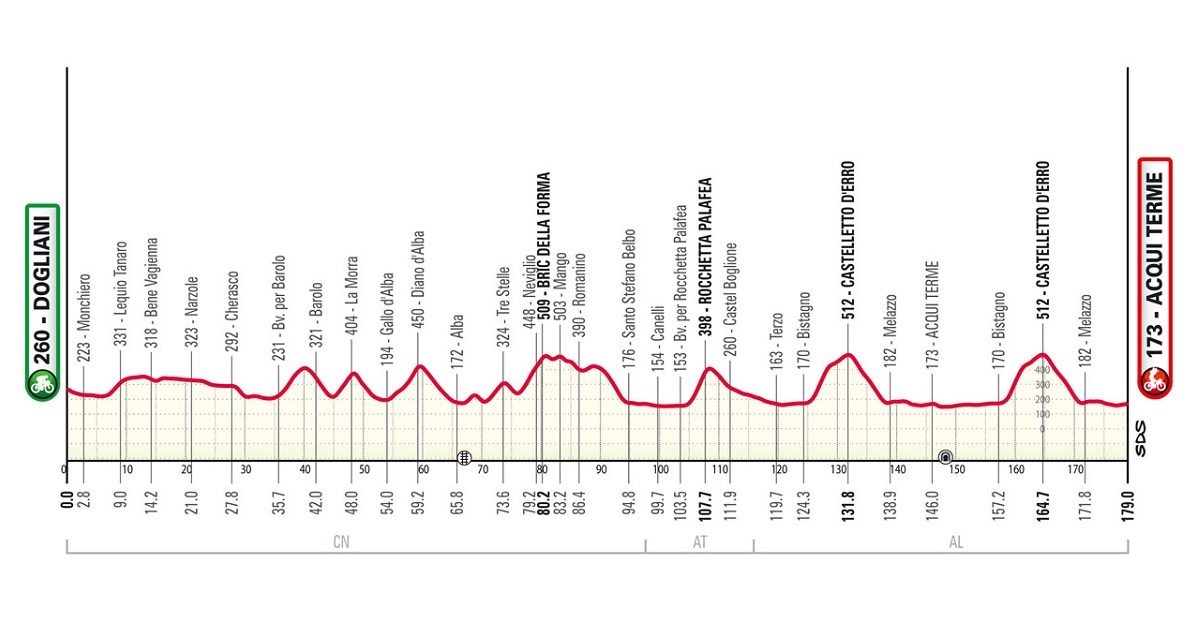 Percorso movimentato e piuttosto impegnativo per il Gran Piemonte 2025. In programma giovedì 9 ottobre, la classica italiana organizzata da RCS Sport collegherà quest’anno Dogliani con Acqui Terme, comune con il quale negli scorsi giorni sembravano esserci degli intoppi di natura economica che avevano fatto ritardare la presentazione del tracciato, ma che evidentemente sono ora stati risolti. La gara misurerà 179 chilometri e proporrà quattro salite ufficiali, la prima delle quali, quella di Bric della Forma, concluderà una prima metà di gara parecchio ondulata sulle strade del cuneese. Seguirà l’ascesa di Rocchetta Palafea, dopo la quale ci si dirigerà verso il circuito finale di 33 chilometri, da ripetere una volta dopo il transito sulla linea d’arrivo; saranno però due i passaggi sulla salita di Castelletto d’Erro (6,1 km al 5,3% con punta del 15%), che verrà scollinata l’ultima volta a poco meno di 15 chilometri dalla conclusione.