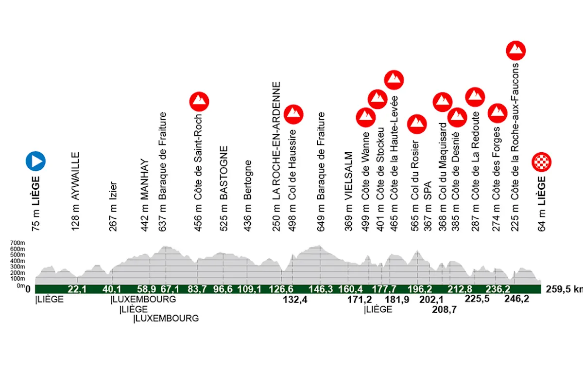 Dopo una decina di chilometri di discesa si arriva ai piedi del Col du Rosier, che con i suoi 4,4 km (al 5,9%) è la salita più lunga in programma. La picchiata verso il centro abitato di Spa è seguita dal Col du Maquisard, una novità rispetto all’anno scorso e dalla Côte de Desnié (1600 m all’8,1%). Da lì si prosegue verso la Redoute, luogo simbolo della Liegi-Bastogne-Liegi con i suoi 1600 metri all’8,1%. Lo scollinamento a 34 km dall’arrivo permette, almeno sulla carta, di organizzare un inseguimento. Ecco allora che diventano decisivi nel finale la Côte des Forges (1300 metri al 7,8%) e soprattutto la Côte de la Roche-aux-Faucons (1300 metri all’11% di pendenza media). Quest’ultima asperità, a 13 km dall’arrivo di Liegi, è di solito il trampolino finale, se l’azione vincente non è già nata.
