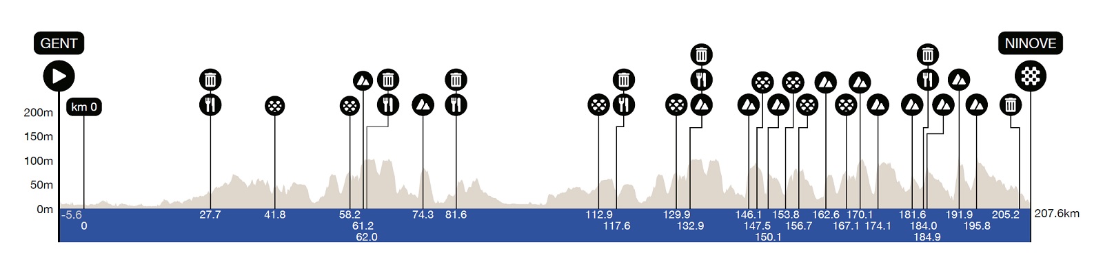 Come nella scorsa edizione, ci saranno da affrontare 8 settori di pavé, mentre i muri da scalare saranno 12 invece di 11, un cambiamento dovuto a un paio di modifiche di percorso. Superata la metà gara, quando inizierà la serie di difficoltà altimetriche, si farà infatti una seconda volta l’Eikenberg al posto del Valkenberg, mentre nel finale viene tolto Elverenberg e aggiunta invece l’accoppiata Tenbosse – Parikerberg, che anticiperà quella classica e potenzialmente decisiva composta da Kapelmuur (o Muro di Grammont) e Bosberg, con quest’ultimo verrà nuovamente scollinato a poco meno di 12 chilometri dalla conclusione.