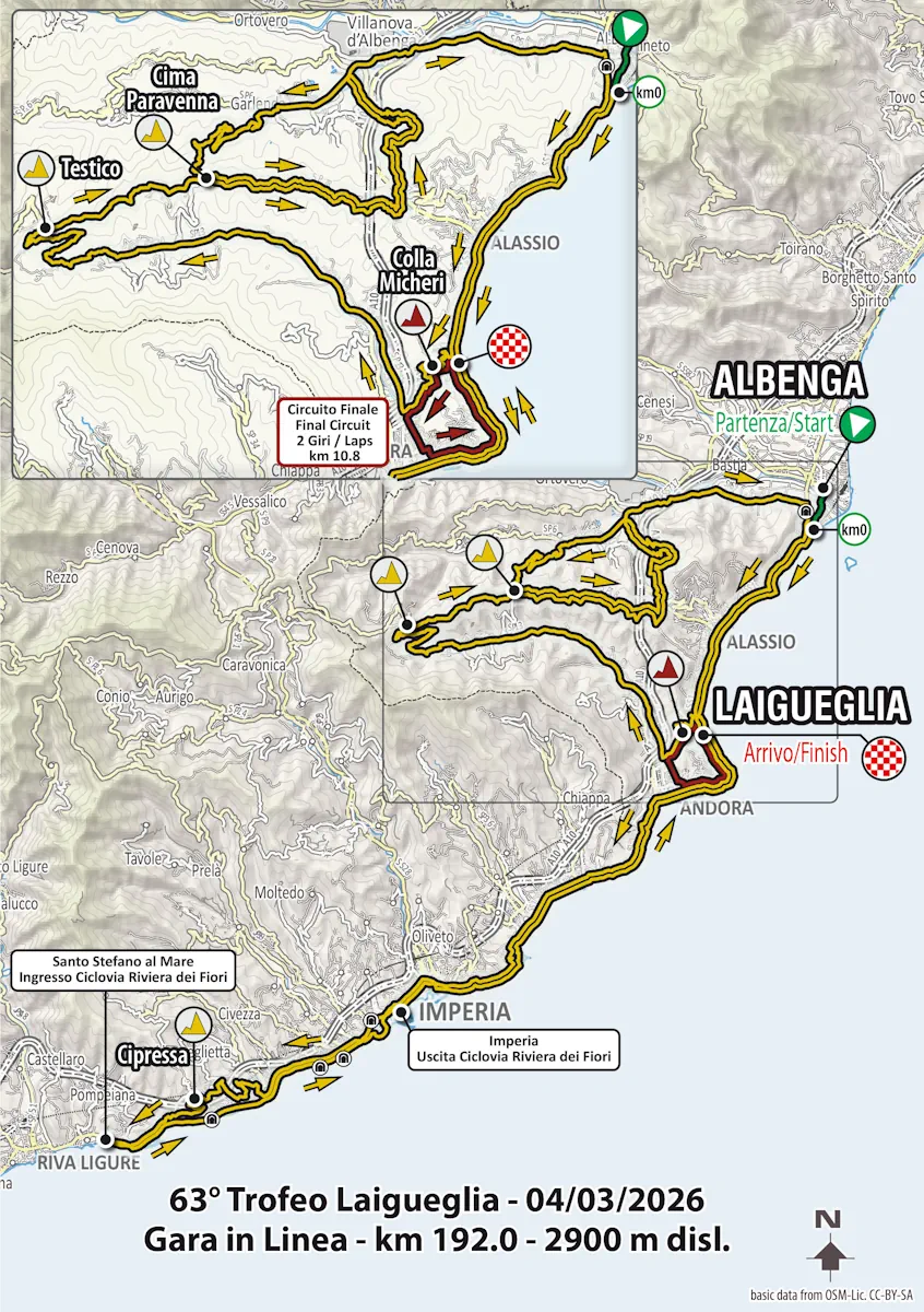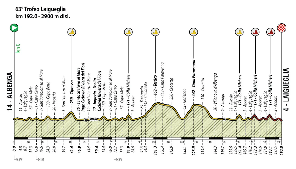 Percorso tra tradizione e novità quello del Trofeo Laigueglia 2026. In programma mercoledì 4 marzo, la corsa ligure quest’anno partirà per la prima volta della sua storia da Albenga, ma soprattutto ha inserito nel suo tracciato la Cipressa, iconica salita della Milano – Sanremo, che verrà affrontata come omaggio alla classicissima visto che l’unico passaggio sarà molto lontano dal traguardo, quest’anno posto a Corso Badarò, sul lungomare, con dunque un ritorno al passato rispetto a quello che è successo negli ultimi anni. Confermate ovviamente le presenze dei tre capi storici, nonché di Colla Micheri, punto cruciale del circuito conclusivo assieme a Capo Mele, che resta l’ultima difficoltà nei 192 chilometri in programma.