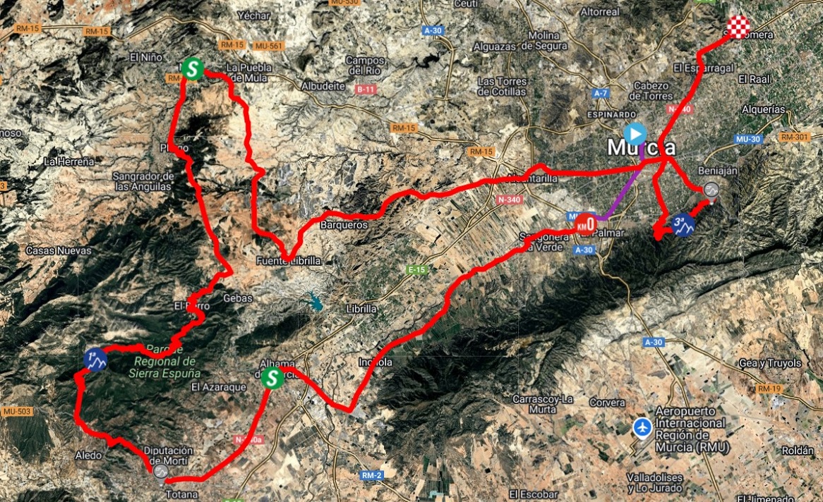 La seconda tappa sarà invece più movimentata e unirà Murcia a Santomera lungo 178,7 chilometri durante i quali si scaleranno prima la tradizionale ascesa dell’Alto Collado Bermejo (denominata Cima Marco Pantani), salita lunga ma posta comunque parecchio lontana dal traguardo, e poi l’Alto Cresta del Gallo, superato a poco più di 22 chilometri dall’arrivo. Sarà quasi certamente questa asperità a selezionare coloro che si giocheranno il successo di giornata e, con buona probabilità, anche quello finale.