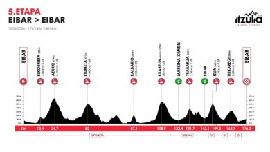 La quinta frazione, 176,2 km con partenza e arrivo a Eibar, sarà quella con il maggior numero di GPM in programma, ovvero otto. Il primo è l’antipasto di giornata e arriva dopo 13,4 km, si tratta del Elkorrieta (2,6 km al 6,7%, max. 13%). Subito dopo la strada inizia a salire verso il GPM di prima categoria di Azurki (7,2 km al 7,2%, max. 16%). Dopo una lunga discesa e un breve tratto di falsopiano si torna in salita, con l’ascesa di Etumeta (4,5 km al 7,5%, max. 10%). Seguirà un tratto con diversi saliscendi per arrivare al km 87 con la salita di Kalbario (2,2 km al 8%, max. 11%). Altro tratto di falsopiano per entrare nella sequenza decisiva di salite, che inizia a 72 km dal traguardo, con il GPM di prima categoria di Krabelin (5 km al 9,6%, max. 17%). Terminata la discesa è previsto il Red Bull KM di Markina, seguito dalla salita di Trabakua (3,3 km al 7,1%, max. 10%). A Eibar è posto lo sprint intermedio, superato il quale inizia l’ascesa di Izua (4,1 km al 9,2%, max. 13%), seguita subito dall’ultima asperità di giornata, Urkaregi (5,2 km al 4,7%, max. 8%). Dallo scollinamento mancheranno 12,5 km all’arrivo, la prima metà in discesa e i restanti in leggera salita fino al traguardo. Vista la sequenza di salite impegnative nel finale, questa giornata potrebbe essere chiave per delineare la classifica generale.