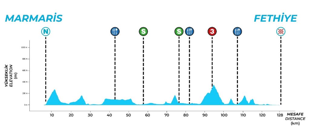 Non bisogna nemmeno sottovalutare la successiva Marmaris – Fethiye (130,4 km), che negli ultimi 40 km presenta diverse difficoltà. La più impegnativa è il GPM (7 km al 4,5%, con gli ultimi 2 km al 7%), che termina a 37 km dal traguardo ed è seguito da una discesa piuttosto tecnica. A quel punto i corridori affrontano due strappi (1,7 km al 5,6% e 2,6 km al 4,8%), prima di una ventina di chilometri pianeggianti. Il finale è tutt’altro che scontato e gli uomini di classifica dovranno farsi trovare pronti.
