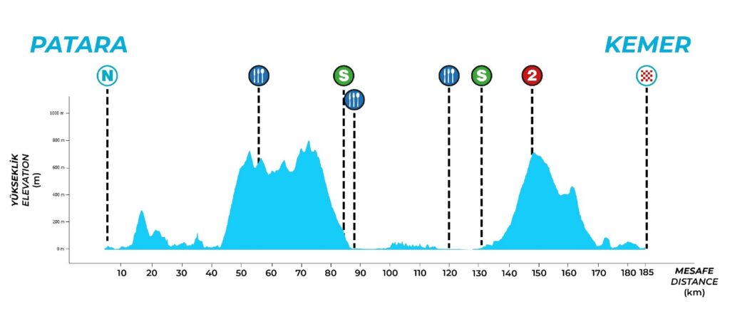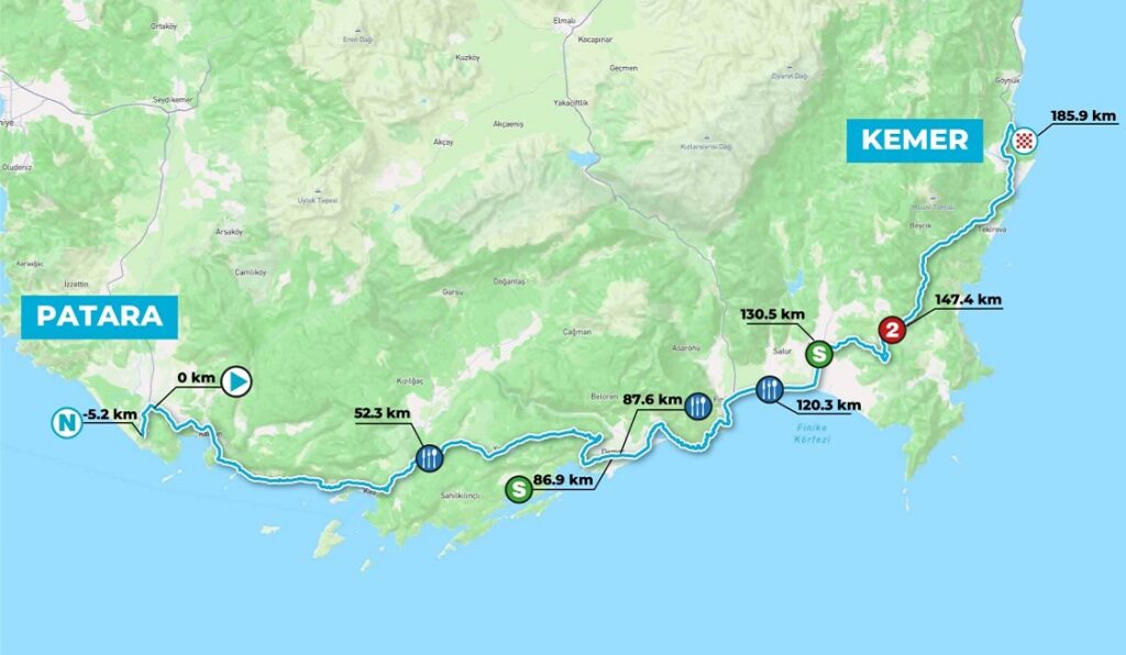 Con i suoi 180,7 km, la quinta tappa è la più lunga del Giro di Turchia. La corsa si sposta da Patara a Kemer affrontando due GPM: il primo al km 35 (9,4 km al 6%), il secondo a 50 km dall’arrivo (7,4 km al 5,6%). Quest’ultimo sarà lo spartiacque della corsa, che dallo scollinamento all’arrivo vede 20 km di discesa (interrotta da un tratto in contropendenza) e 20 di pianura. Sulla carta sembra una giornata disegnata per le fughe ma non si possono escludere né imboscate da uomini di classifica né un arrivo in volata a ranghi relativamente larghi, a seconda della velocità a cui vengono affrontate le due salite.