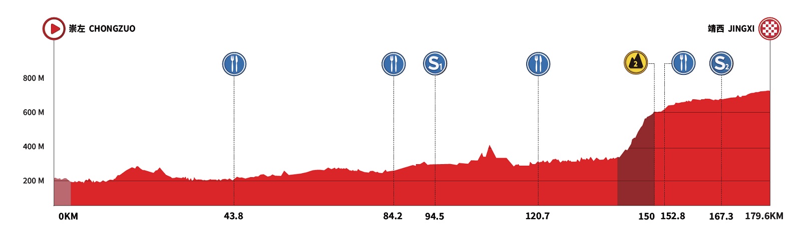 Uno scenario diverso potrebbe vedersi per la prima volta nella Jingxi – Bama, che con i suoi 214 km è la tappa più lunga della corsa cinese. In questo caso la corsa si accenderà dopo il traguardo volante di Tianyang, posto a 80 km dalla conclusione. Da quel punto inizieranno le difficoltà altimetriche, con tre GPM: il primo misura 9,5 km al 2,8% medio, il secondo 1,7 km al 5,8% e il terzo, ad appena 14 km dall’arrivo, 1 km al 3,7%. Quest’ultimo potrebbe essere la rampa di lancio per un’eventuale azione di un gruppetto, anche se le pendenze non dovrebbero fare una differenza estrema. Non è da escludere, allora, che si arrivi di nuovo in volata.