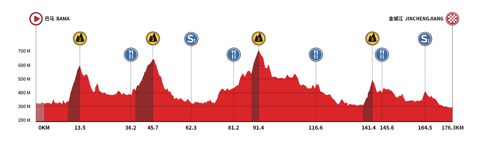 Nella Bama – Jinchengjiang (176,8 km) sono invece inseriti ben 5 GPM, ma anche in questo caso non è detto che ci sia il terreno adatto per staccare tutti i velocisti. Subito dopo la partenza si affronta una prima salita da 4,8 km al 6,3%, che può fare da trampolino di lancio per l’eventuale fuga di giornata, che potrebbe anche avere qualche chance di arrivare fino in fondo. Dopo altri due GPM di media difficoltà, il tratto decisivo è negli ultimi 35 km, con una salita di 3,8 km al 6,3% seguita da un lungo falsopiano discendente fino ai piedi dell’ultima asperità, uno strappo di 800 metri al 7% posizionato a 12 km dal traguardo: forse troppi per un’azione solitaria, ma bisognerà vedere la situazione di corsa di quel momento.