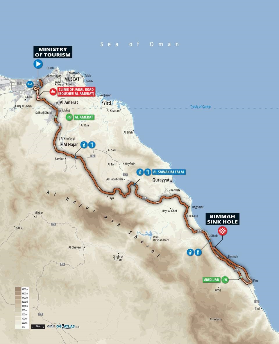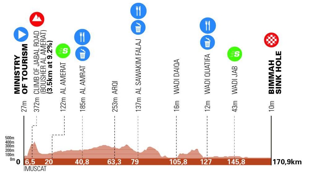 Il percorso del Tour of Oman 2026 segue la falsa riga della precedente edizione. La corsa si apre con la frazione da Muscat (Ministry of Tourism) a Bimmah Sink Hole, 170,9 km dedicati ai velocisti. L’unica vera difficoltà altimetrica infatti è la salita di Jamal Road poco dopo la partenza, 3,5 km al 9,2%). Un’asperità da non sottovalutare, che può sicuramente favorire la formazione della fuga di giornata, ma poiché termina al km 10 non dovrebbe avere ulteriore impatto sulla corsa. Dopo i passaggi dagli abitati di Al Amerat, Al Amrat, Wadi Daiqa e Wadi Jab, lungo un percorso pianeggiante che attraversa anche un tratto di deserto, i corridori arriveranno verso la sede d’arrivo, dove è facile pronosticare uno sprint.