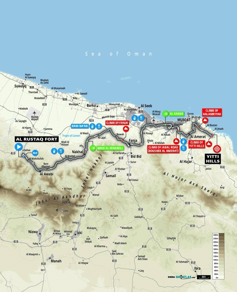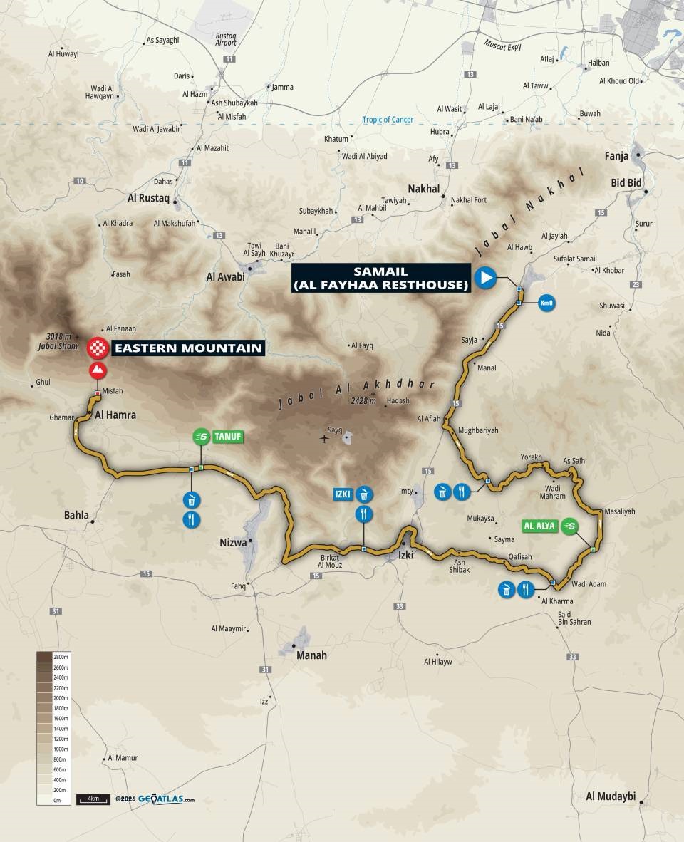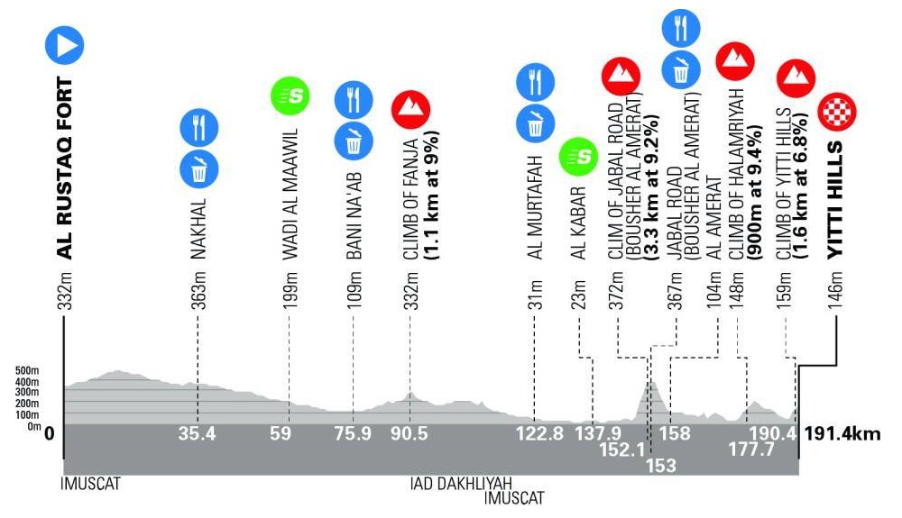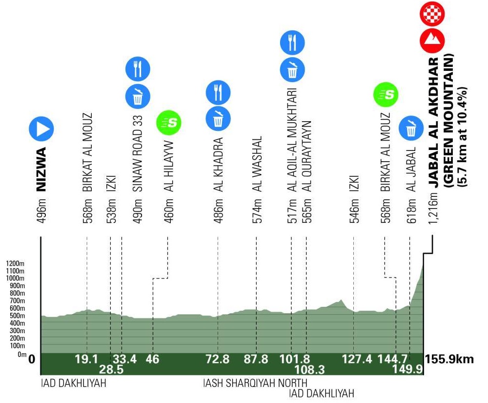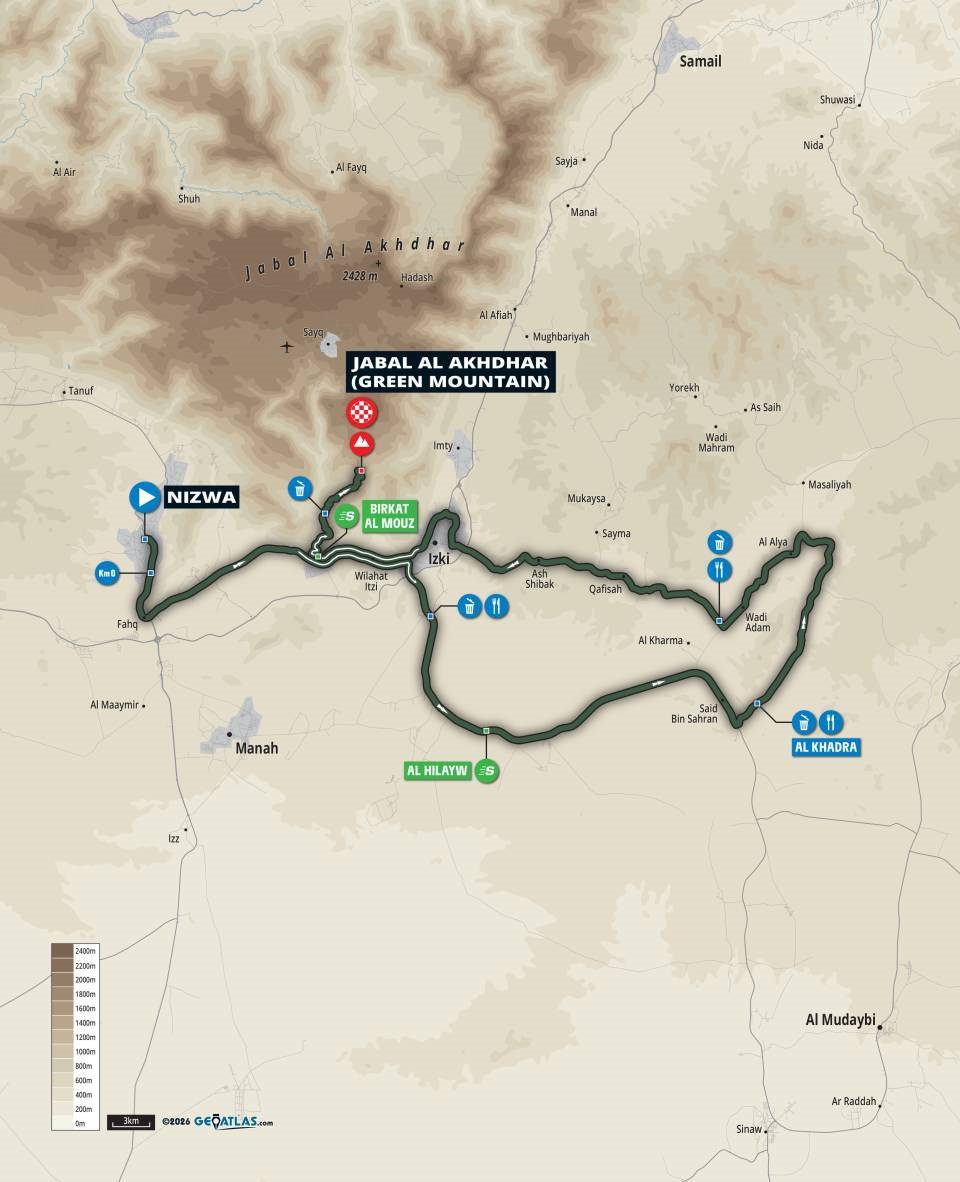 Ancora una volta, il verdetto finale della corsa sarà scritto nella Nizwa – Jabal al Akhdar, con l’arrivo sulla Green Mountain. Si parte da Nizwa per passare da Birkat Al Mouz e, svoltando a destra prima di Izki, si intraprende un lungo anello con strade in mezzo al deserto che toccano gli abitati di Al Hilayw, Al Khadra, Al Washal e Al Quraytayn, prima di arrivare a Izki e di nuovo a Birkat Al Mouz. Da qui, dov’è posto l’ultimo traguardo volante della corsa, si svolta a destra per Al Jabal, che conduce ai piedi della salita finale. La Green Mountain, con i suoi terribili 5,7 km al 10,4% di pendenza media, è disegnata apposta per riscrivere completamente le gerarchie dei più forti ed eleggere il vincitore finale della competizione omanita. Uno sforzo brutale, che vede anche i migliori scalatori arrivare stremati sul traguardo.