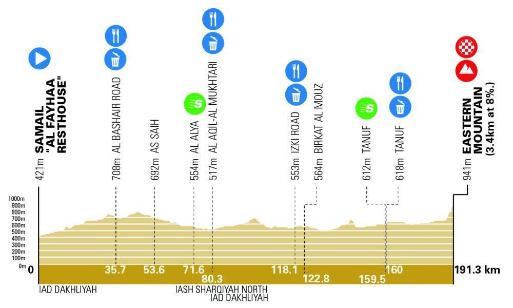 La classifica generale dovrebbe iniziare a muoversi in occasione della terza tappa, da Samail alla Eastern Mountain. Per gran parte dei 191,3 km in programma, l’insidia principale sarà il vento, dato che non sono previste particolari asperità. Il primo tratto in falsopiano ascendente porta il gruppo fino ai 700 metri sul livello del mare di Al Bashair Road, sede della prima zona di rifornimento fisso. Superati Al Saih, Al Alya, Birkat Al Mouz e Tanuf, la corsa si dirige ai piedi della salita finale, appunto la Eastern Mountain: con i suoi 3,4 km all’8%, è il terreno ideale per gli scalatori, meglio se dotati di una certa esplosività.