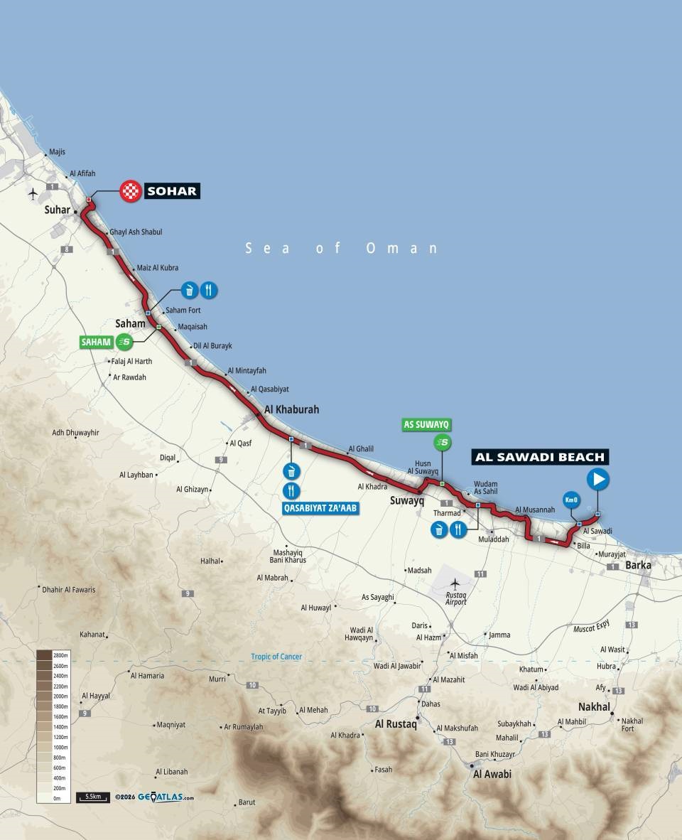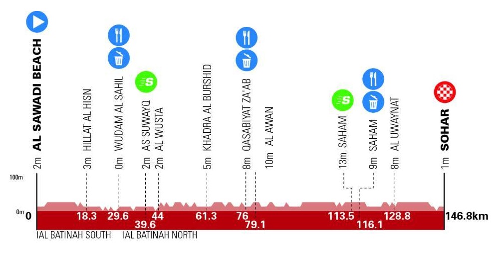 La Al Sawadi Beach – Sohar si candida per essere la tappa migliore per i velocisti al via. Lungo i suoi 146,8 km, la frazione non arriva mai oltre i 13 metri sul livello del mare: basta questo per spiegare come i passisti saranno i veri protagonisti della giornata, sia per la formazione di eventuali ventagli sia per preparare lo sprint finale, oltre alla protezione dei capitani della classifica generale. L’incognita principale sarà ancora il vento: il percorso costeggia il mare dell’Oman, dove è facile ci siano raffiche anche importanti. Se dovesse essere laterale, qualche squadra potrebbe cercare l’offensiva. In caso contrario, è facile pronosticare tre ore di attesa alla volata.
