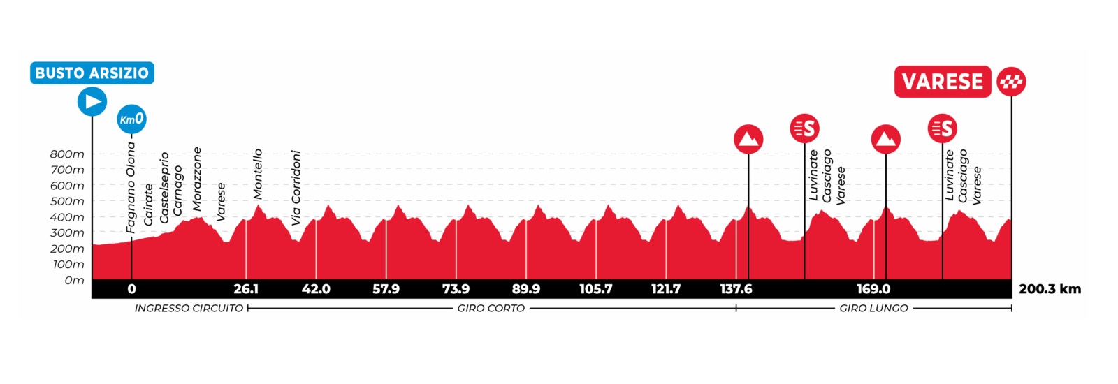 La corsa prenderà il via, per il quinto anno consecutivo, da Busto Arsizio, precisamente dal Museo del Tessile, da dove ci si muoverà per il tratto di trasferimento dal quale poi si punterà verso nord pedalando sulle strade del sud della provincia, con un primo tratto di leggera salita verso Carnago e Morazzone dove la fuga potrebbe prendere lo slancio giusto. Ci vorrà tuttavia poco per entrare nel primo dei due circuiti di giornata, visto che dopo 22,2 chilometri dalla partenza, con l’inizio della prima scalata dell’ascesa dei Ronchi, si inizia a salire in maniera consistente. A seguire ci sarà il primo passaggio sulla linea d’arrivo di Varese, in Via Sacco, che segnerà l’inizio del primo dei sette giri da 15,9 chilometri del cosiddetto circuito corto.