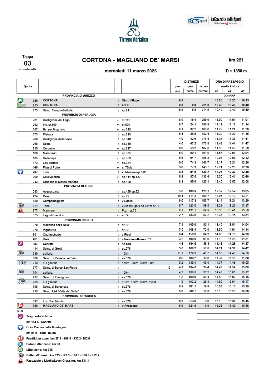 Cronotabella Terza Tappa Tirreno-Adriatico 2026