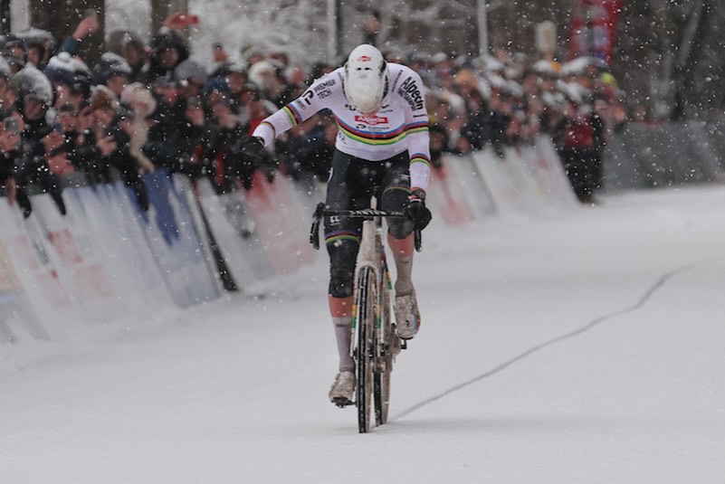 Mathieu van der Poel intanto prosegue indisturbato, iniziando l’ennesima cavalcata solitaria che lo porterà a vincere dopo un’ora di corsa la sua 19ª gara consecutiva, imbattuto da ormai quasi due anni. L’unica rivale è ormai la neve, che cade sempre copiosamente, ma senza il rivale di sempre a tallonarlo può gestirsi e correre meno rischi, pur arrivando completamente stremato e infreddolito. Dopo 1’23” arriva Aerts, mentre poco dopo conclude Orts. Sotto i tre minuti arriva anche Joran Wyseure, mentre per tutti gli altri distacchi abissali con Thomas Mein, quinto, che chiude la sua gara 3’45” dopo il campione del mondo.