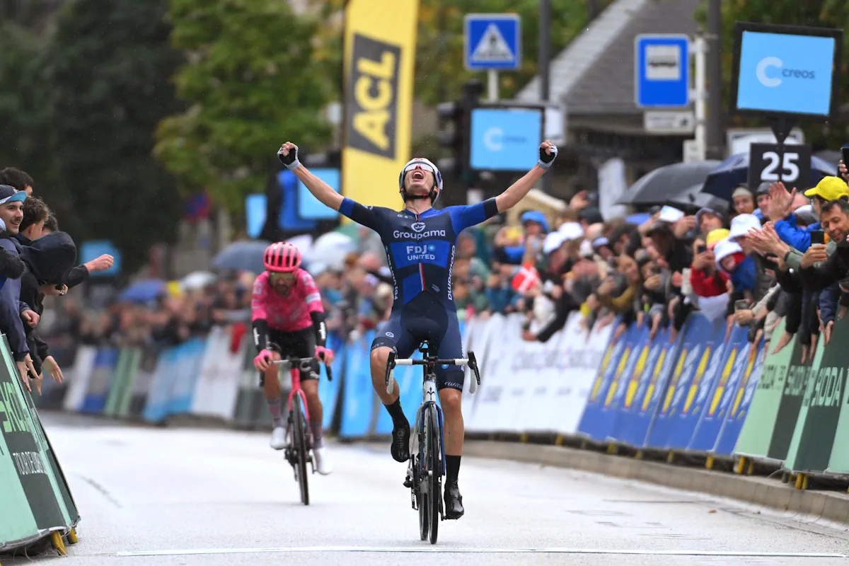 Davanti intanto Wenzel sbaglia una curva in discesa a 14 chilometri dal traguardo e non riesce più a rientrare, malgrado inizialmente perda solo pochi metri. L’azione degli altri due prosegue invece fino all’arrivo, con un gap che arriva fino a superare il minuto, mentre dietro di loro la UAE Team Emirates XRG fa buona guardia rispetto agli altri uomini di classifica, senza preoccuparsi troppo della coppia di testa, non particolarmente minacciosa per il successo finale. I due corridori al comando arrivano così a giocarsi il successo sullo strappo conclusivo, dove ad avere la meglio è Grégoire, che allunga entrando nel chilometro finale prendendosi quei pochi metri di margine che gli consentono di resistere poi al ritorno dell’irlandese.