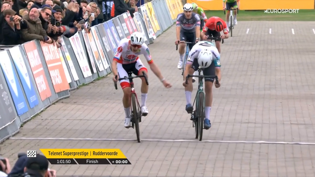 Finale tiratissimo nella prova maschile del Superprestige di Ruddervoorde. Ad avere la meglio al termine di una gara molto combattuta è stato Michael Vanthourenhout (Pauwels Sauzen-Altez Industriebouw), che ha regolato allo sprint uno Joris Nieuwenhuis (Ridley Racing Team) andato all’attacco a metà corsa e in seguito raggiunto dal belga e dagli altri principali big presenti. Tra questi anche Toon Aerts (Deschacht-Hens CX Team), scivolato però proprio in ingresso all’ultima curva mentre si trovava in terza posizione, quando poteva quantomeno giocarsi un posto sul podio. Su quest’ultimo sale invece Niels Vandeputte (Alpecin-Deceuninck), che ripete così lo stesso piazzamento ottenuto ieri nell’Exact Cross di Essen.