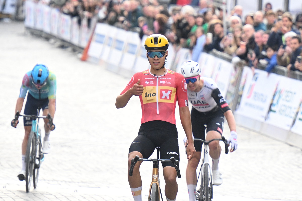 Si sgancia infatti un drappello comprendente Tim Wellens (UAE Team Emirates XRG), Ramses Debruyne (Alpecin-Deceuninck), Romain Gregoire (Groupama-FDJ), Christian Scaroni (XDS Astana Team), Jenno Berckmoes (Lotto), Marc Hirschi (Tudor Pro Cycling Team) e Alessandro Pinarello (VF Group Bardiani-CSF Faizanè), che tuttavia ha ancora circa due minuti da recuperare sulla testa della corsa, dove Negrente e Fagundez faticano a rimanere con gli altri sul penultimo passaggio da La Tisa, ma riescono poi a rientrare. Tra gli inseguitori non c’è tuttavia grande accordo, così Wellens decide di allungare e, assieme a Debruyne, riesce a recuperare una quarantina di secondi ai battistrada in vista dell’ultimo passaggio sul muro in pavé.