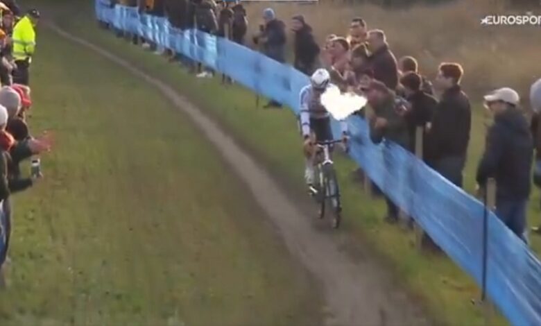 Cyclo-cross, Mathieu van der Poel plaisante après s’être fait « vaper » au visage par un spectateur lors de la course Hofstade : « C’est mieux que la bière… ».