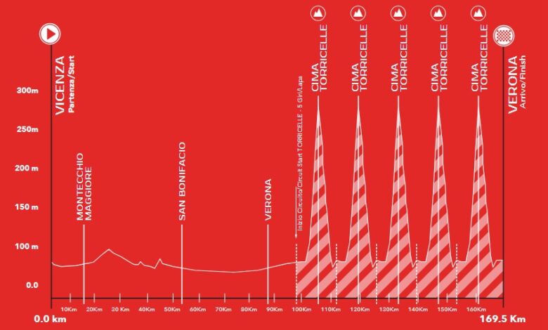 C’est un Parcours renouvelé sur lequel se déroulera le Giro del Veneto 2025. Programmée le mercredi 15 octobre, la classique italienne s’est toujours terminée ces dernières années à Vicenza, sur les rampes du Monte Berico, tandis que pour cette édition, la ville de Palladio accueillera le départ de la course, qui mesurera 169,5 kilomètres au total. Parmi ceux-ci, les 100 premiers kilomètres seront essentiellement plats et mèneront le peloton jusqu’à Vérone, où ils devront effectuer cinq tours d’un circuit de 15 kilomètres qui comprend la Torricelle, une ascension de 3200 mètres qui a également été incluse dans les championnats du monde de 1999 et 2004 et qui a été complétée pour la dernière fois à moins de neuf kilomètres de la ligne d’arrivée.