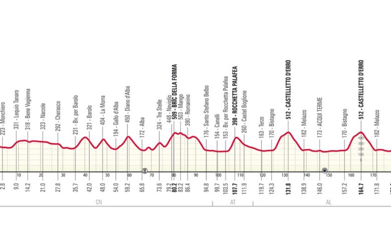 Parcours mouvementé et plutôt difficile pour le Gran Piemonte 2025. Prévue pour le jeudi 9 octobre, la classique italienne organisée par RCS Sport reliera cette année Dogliani à Acqui Terme sur 179 kilomètres vallonnés, dont quatre ascensions. La première moitié de la course se déroulera dans la région de Cuneo et s’achèvera après l’ascension de Bric della Forma, puis de Rocchetta Palafea. À ce moment-là, elle se dirigera vers le circuit final de 33 kilomètres, à répéter une fois après le passage sur la ligne d’arrivée, mais il y aura deux passages sur la montée du Castelletto d’Erro (6,1 km à 5,3 % avec une pointe à 15 %), qui sera la dernière à un peu moins de 15 kilomètres de l’arrivée.
