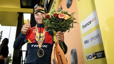 La malchance continue pour Lennert Van Eetvelt. Mauvaise nouvelle pour le coureur flamand, qui n’a pas participé à une course depuis qu’il a été contraint d’abandonner leTour de France avant le départ de la 15e étape, et qui risque désormais de ne plus pouvoir porter de dorsale jusqu’à l’année prochaine. Après avoir chuté lors de la deuxième étape de la Grande Boucle, souffrant de problèmes de dos qui l’ont contraint à l’abandon, le coureur de 24 ans de Lotto semble souffrir plus que prévu initialement et, après avoir été contraint de manquer la Vuelta a España, il ne pourra presque certainement pas prendre le départ des deux courses canadiennes de fin de saison que sont le Grand Prix Cycliste de Québec et le Grand Prix Cycliste de Montréal, prévues la semaine prochaine.