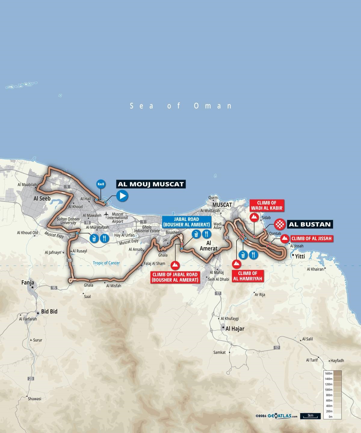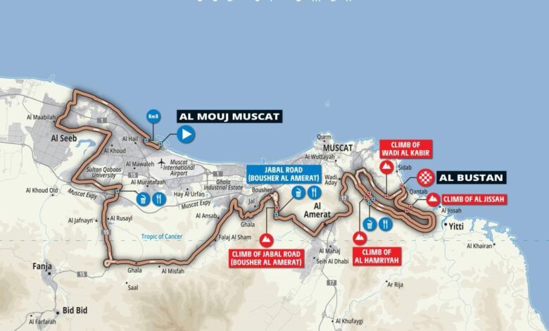 La Muscat Classic 2026 aura un Parcours pratiquement inchangé par rapport à l’année dernière. Promue à la catégorie UCI 1.Pro cette année, la course, qui se déroule 24 heures avant le départ du Tour d’Oman, en est à sa quatrième édition et se déroulera le vendredi 6 février, offrant un parcours assez sélectif de 174 kilomètres qui commence une fois de plus à Al Mouj Muscat et se termine à Al Bustan, en suivant les mêmes routes que les trois dernières années. Après une première moitié de course essentiellement plate, la seconde moitié verra les coureurs s’attaquer à la Jabal Road, au Wadi Al Kabir et, à deux reprises, à Hamriyah et à Al Jissah, ce dernier tronçon se terminant à quelques kilomètres de la ligne et constituant le tremplin idéal pour une attaque victorieuse. Il est donc possible qu’un coureur seul triomphe, comme en 2024, ou que le succès de la journée se décide au sprint par un petit groupe, comme en 2023 et 2025, lorsque Rick Pluimers s’est imposé.