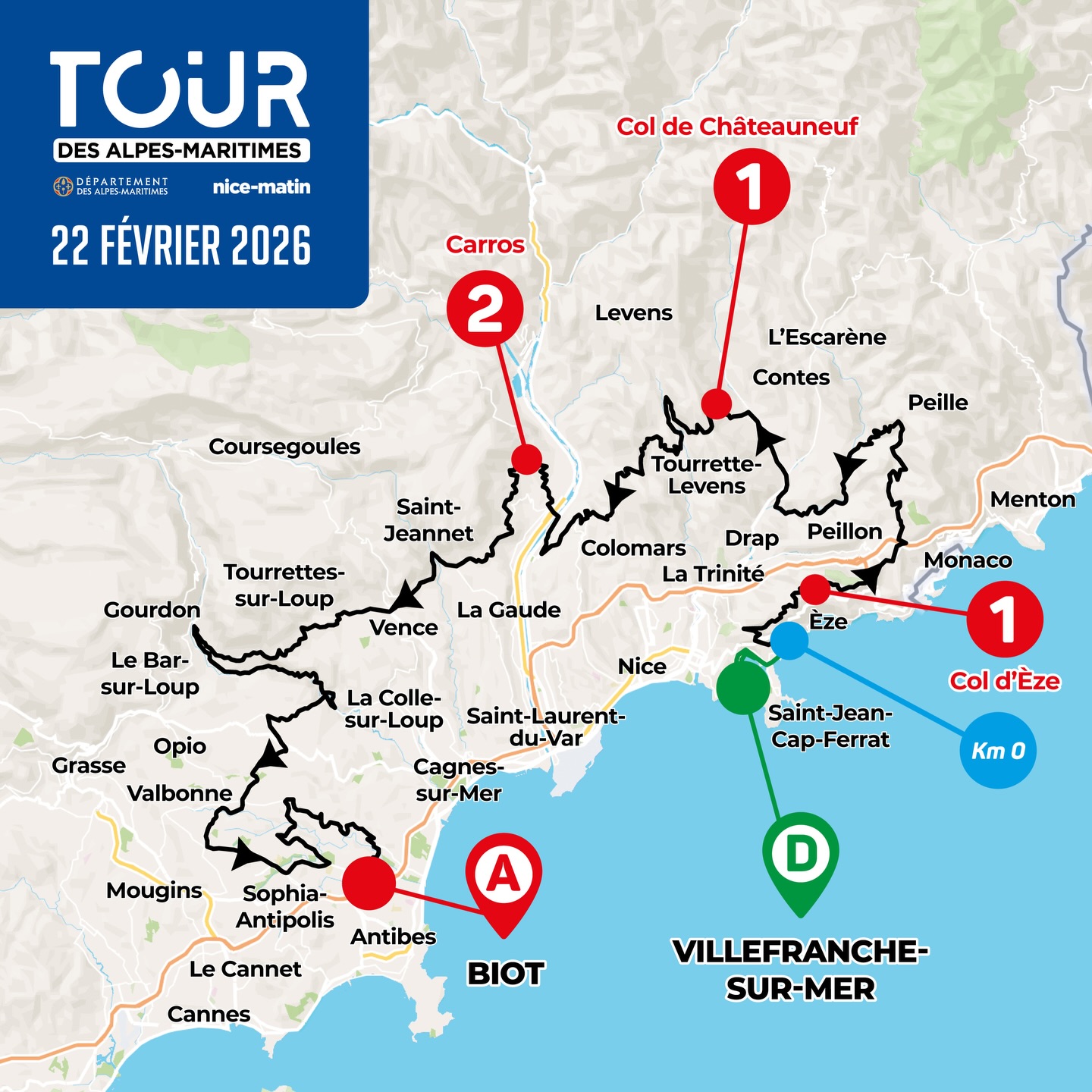 Une seule journée de course pour le Tour des Alpes-Maritimes 2026. Programmée le dimanche 22 février, la course transalpine jumelée en 2025 par Christian Scaroni passera d’une course par étapes de deux jours (il y en avait trois jusqu’en 2023, avant la naissance du Classic Var) à une classique, proposant un parcours plutôt mouvementé au départ de Villefranche-sur-Mer et à l’arrivée à Biot. Le parcours reprendra en partie celui de la deuxième étape de l’édition de l’année dernière et, dans la première moitié, verra les coureurs s’attaquer aux ascensions du Col d’Èze, du Col de Châteauneuf et de Carros, tandis que dans la seconde moitié, il sera un peu moins exigeant, ouvrant ainsi la course à différents types de coureurs.
