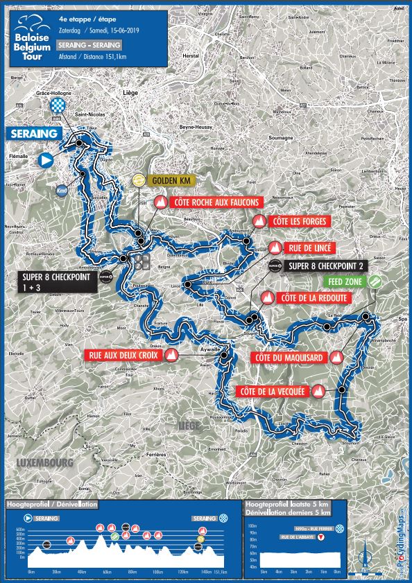 En Wallonie, la quatrième étape devrait proposer un grand spectacle. Les ascensions répétées de la Roche-aux-Faucons et de la Rue du Fort émaillent le final, alors qu’il faudra auparavant gravir la Côte de la Redoute. Sur 151 kilomètres autour de Seraing, cette journée devrait être un concentré d’action. Enfin, l’épreuve se terminera sans doute comme elle a commencé : par un sprint massif. Le parcours est sans difficulté et devrait donc offrir une deuxième opportunité aux hommes rapides. Parmi eux, Fabio Jakobsen (Deceuninck-Quick Step), Bryan Coquard (Vital Concept-B&B Hotels), Christophe Laporte (Cofidis), Matteo Moschetti (Trek-Segafredo), Niccolo Bonifazio (Total Direct Energie), Timothy Dupont (Wanty-Gobert) ou encore Rudy Barbier (Israel Cycling Academy) font le déplacement.