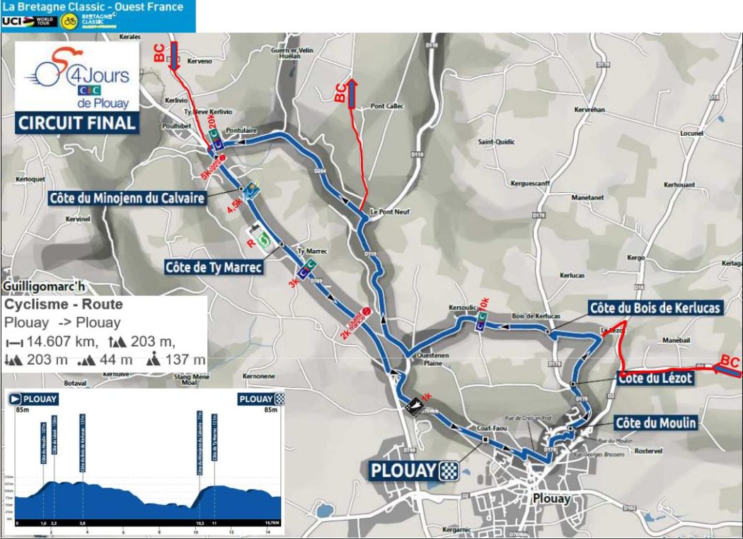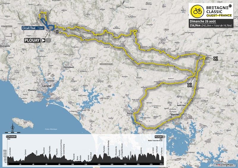 Les organisateurs de la Bretagne Classic ont décidé d’un nouveau final cette année. Plus dur qu’à l’accoutumée, celui-ci devrait réduire les chances des sprinteurs, sans pour autant les éliminer totalement. La course se divise en fait en deux parties : d’abord une longue boucle de 242,2 kilomètres qui part de Plouay pour y ramener les coureurs vers un circuit accidenté de 14,7 kilomètres. Le circuit final comporte cinq côtes, dont celle de Ty Marrec (1,5km à 5,5%).