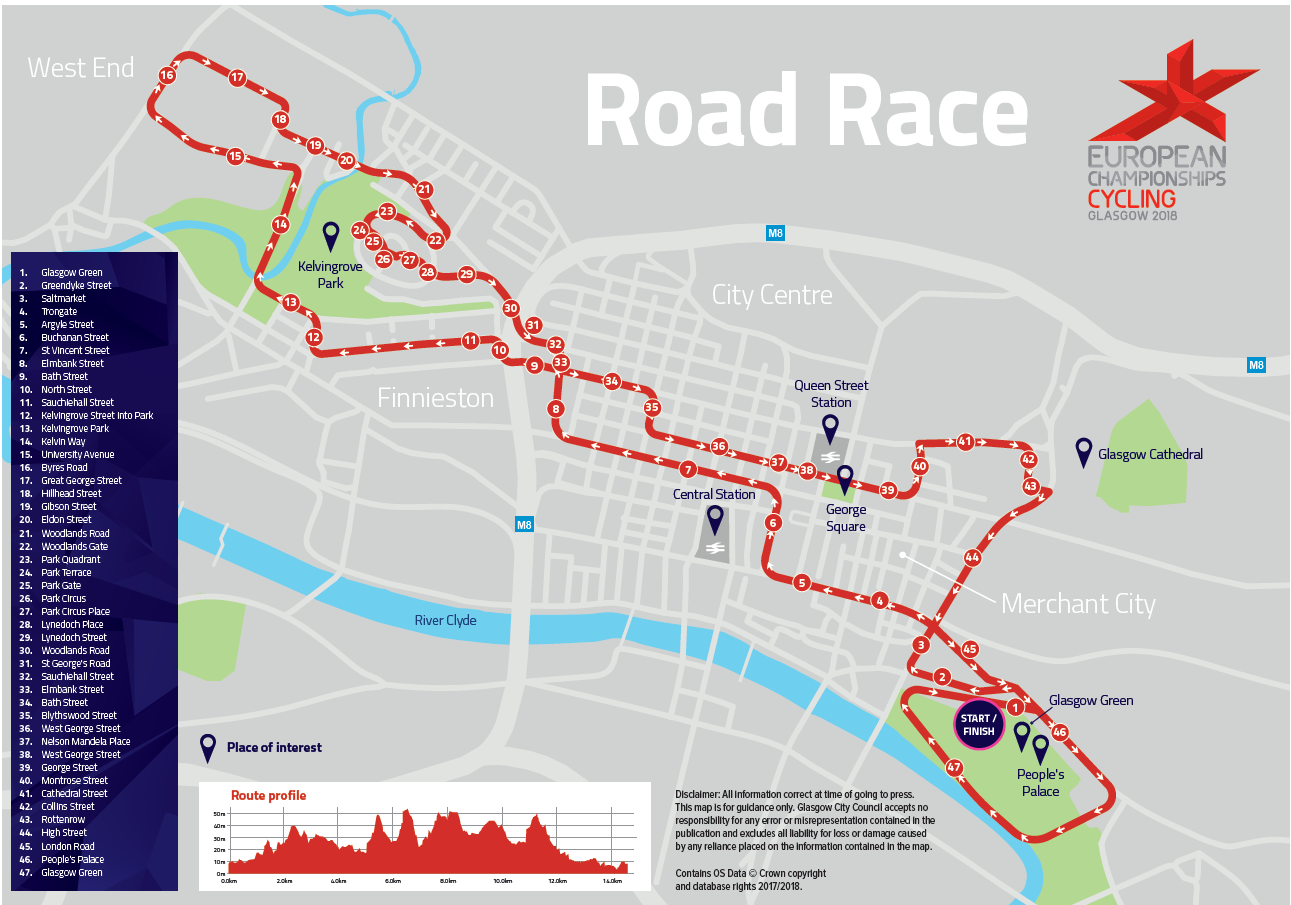 Ce dimanche, le départ du Championnat d’Europe sera donné à 11h35 de Glasgow. La course se déroule en 16 tours de circuit urbain pour un total de 230,4 kilomètres parcourus à la fin de la journée. Le départ et l’arrivée du circuit se feront à Glasgow Green, le plus ancien parc public de Grande-Bretagne. De là, le parcours monte lentement vers le nord. Les quatre premiers kilomètres sont plats, la difficulté résidant dans les dix bornes plus escarpées qui suivent. Les coureurs ne dépasseront cependant pas 60 mètres d’altitude au fil de l’épreuve. Ainsi c’est plutôt la répétition des portions montantes, surtout si l’allure est rapide dès les premiers tours, que leur dureté qui pourrait faire des différences.