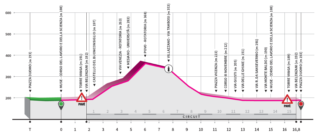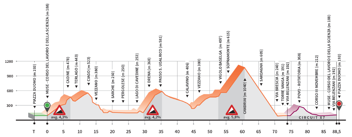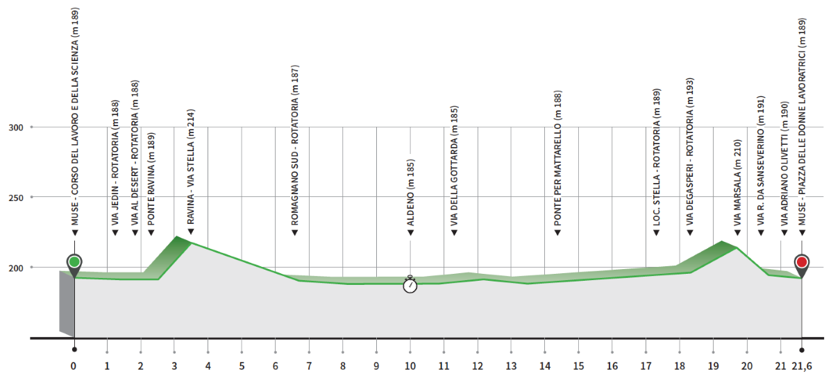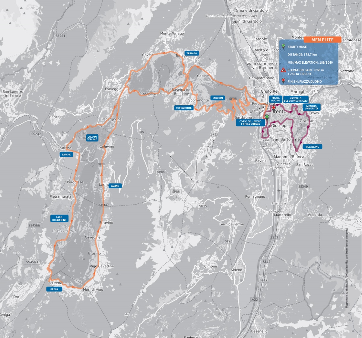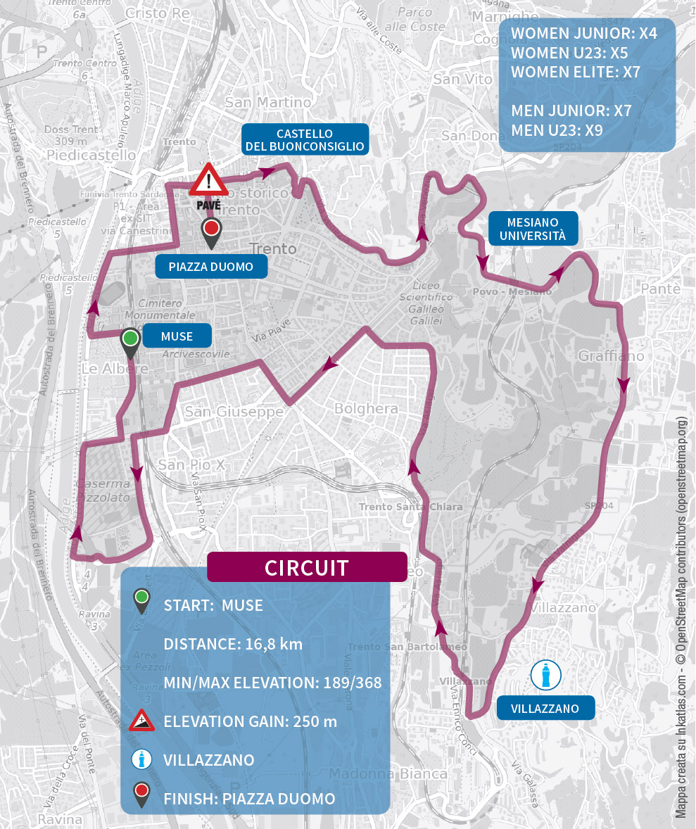 Les championnats d’Europe 2020 connaissent leur parcours. Treize épreuves seront disputées du 9 au 13 septembre, dans la province du Trentin. Les contre-la-montres se dérouleront sur un circuit commun de 23 kilomètres. Les épreuves en ligne comprennent une base commune avant un circuit de 16,8 kilomètres à répéter un nombre variable de fois en fonction de la catégorie. Pour ce qui est de l’épreuve élite hommes, il y aura sept tours à couvrir pour un total de 178 kilomètres et un dénivelé positif de près de 1800 mètres.