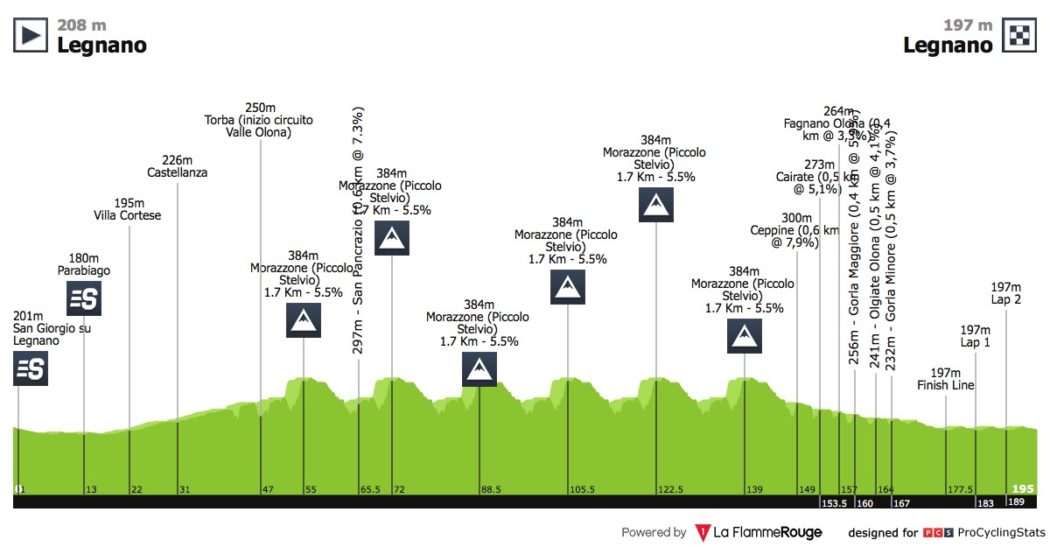 Départ et arrivée de Legnano, en Lombardie, pour un total de 194,7 kilomètres à parcourir. Comme pour la Coppa Agostoni remportée par Gianni Moscon (Sky) la veille, la course se divise en trois parties. Une première relativement plate conduira le peloton à un circuit plus difficile. En son sein, le Morazzone (1,7km à 5,5%) sera la principale difficulté du jour et devra être emprunté à six reprises. Cependant, après le dernier passage du sommet, il restera encore 48 kilomètres de descente et de plaine. L’occasion pour les équipiers de sprinteurs de revenir sur d’éventuelles échappées. Finalement, la course se termine par un autre circuit de 5,8 kilomètres autour de Legnano, à répéter trois fois. Contrairement à la veille, un sprint massif semble l’issue privilégiée.