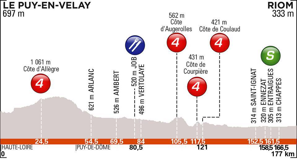 Après deux étapes mouvementées, le temps des sprinteurs est venu. 177 kilomètres sont au programme de la troisième étape du Critérium du Dauphiné ce mardi, entre Le Puy-en-Velay et Riom. Si quatre difficultés sont répertoriées au classement de la montagne, elles le sont toutes en quatrième catégorie et ne devraient pas priver les hommes rapides d’une belle explication. Il faudra donc négocier la Côte d’Allègre (4e cat., 2,1km à 4,7%) en début de parcours avant un enchaînement de trois bosses entre le km100 et le km121 : Côte d’Augerolles (4e cat., 4,9km à 3,5%), Côte de Courpière (4e cat., 2km à 4,7%) et Côte de Coulaud (4e cat., 1,2km à 5,6%). La dernière étant située à 56 kilomètres de l’arrivée, les équipes de sprinteurs auront largement le temps de mener la poursuite des échappés. D’autant que le parcours est plat jusqu’à Riom. Le sprint livrera alors son verdict au terme d’une longue ligne droite de 5000 mètres.