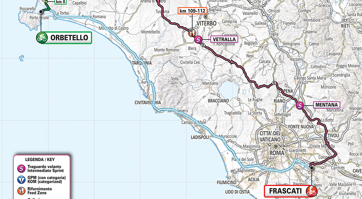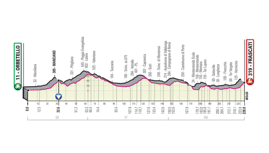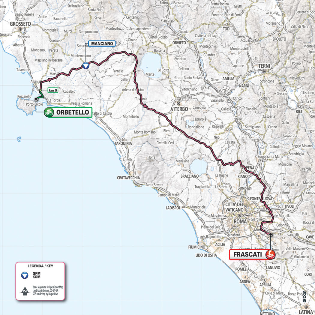 Le parcours de l’étape s’en trouve modifié, avec l’ajout de sept kilomètres pour contourner la capitale. Un changement qui a son importance puisque l’étape sera longue de 235 kilomètres. Le final a également était changé, et semble plus exigeant qu’auparavant. Les 2500 derniers mètres sont en montée, entre 4 et 5 % de moyenne, dans les rues de Frascati.