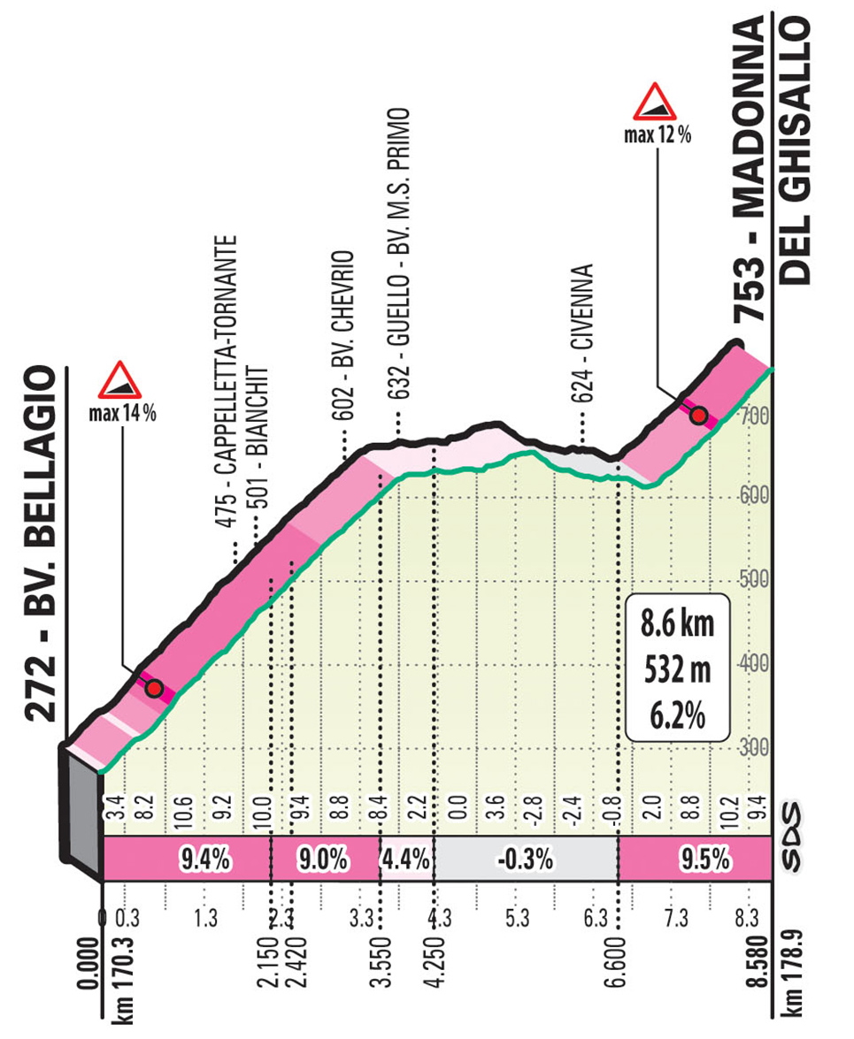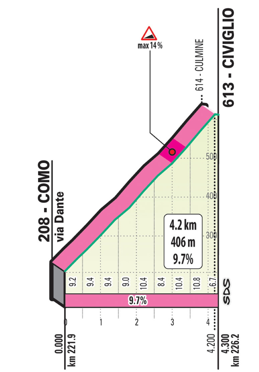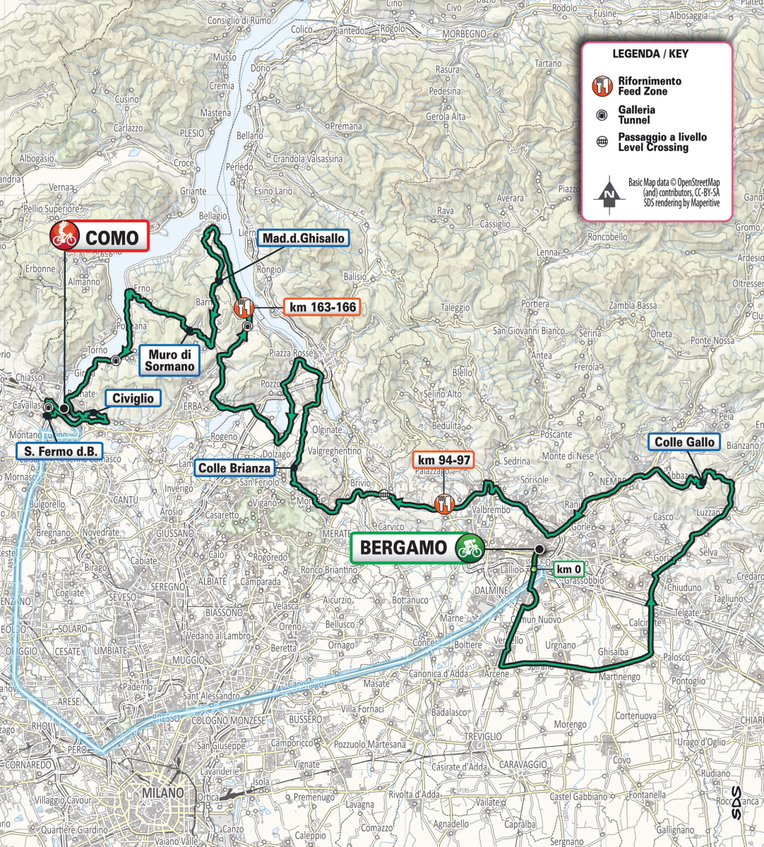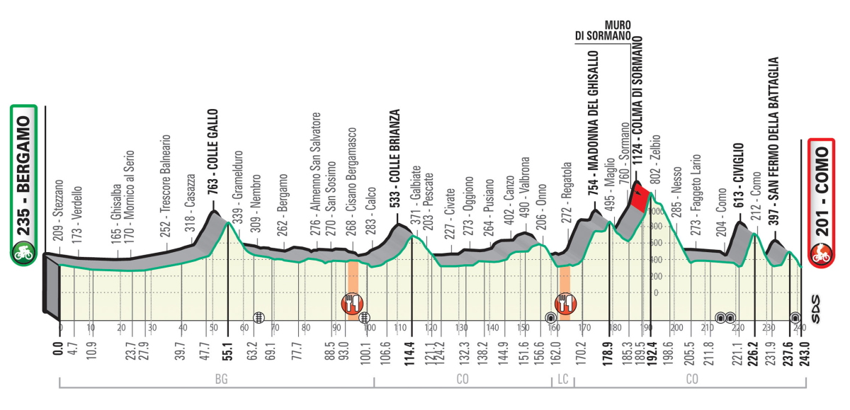 Le parcours est similaire à celui de l’édition précédente. Il y aura alors le Colle Gallo (7,4km à 6%, passage max 10%) en première ascension, après 47 kilomètres de course. Suivra une longue portion descendante pour aller chercher le Colle Brianza, puis les choses sérieuses commenceront à l’approche de la Madonna del Ghisallo (8,5km à 6,2%, max 14%). Directement après, il faudra enchaîner avec l’ascension du Sormano (5,1km à 6,6%) puis le mythique mur qui suit (1,9km à 15,8%, max 27%). Enfin, il faudra escalader le Civiglio (4,2km à 9,7%, max 10%) et aborder la montée de San Fermo della Battaglia (2,7km à 7,2%, max 10%) avant d’aller chercher la ligne d’arrivée.