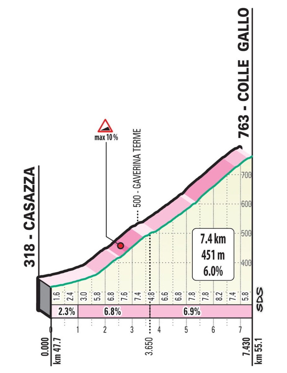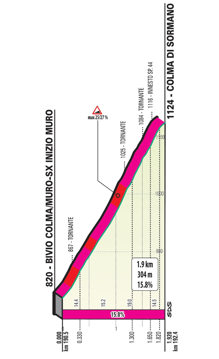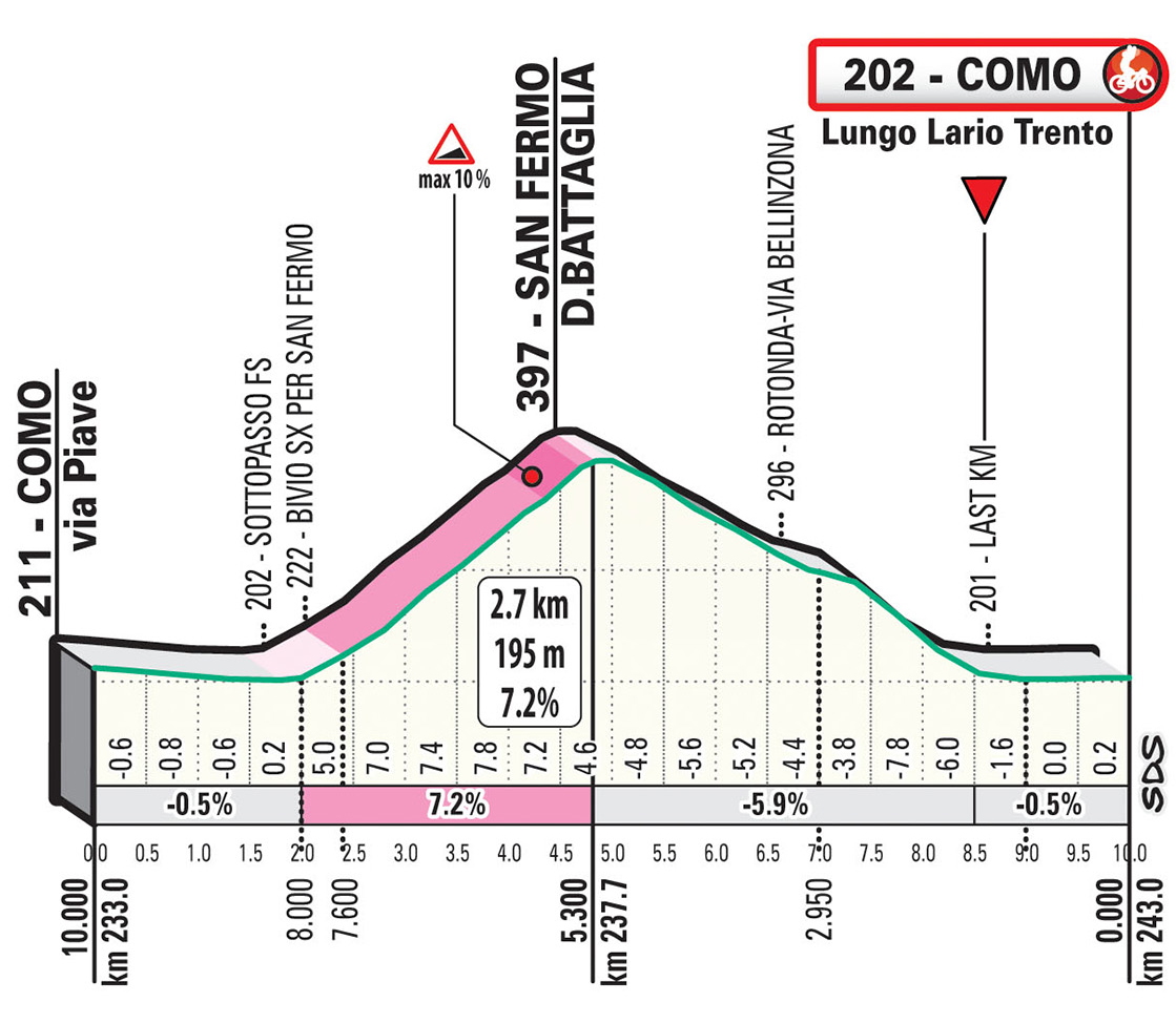 Le parcours est similaire à celui de l’édition précédente. Il y aura alors le Colle Gallo (7,4km à 6%, passage max 10%) en première ascension, après 47 kilomètres de course. Suivra une longue portion descendante pour aller chercher le Colle Brianza, puis les choses sérieuses commenceront à l’approche de la Madonna del Ghisallo (8,5km à 6,2%, max 14%). Directement après, il faudra enchaîner avec l’ascension du Sormano (5,1km à 6,6%) puis le mythique mur qui suit (1,9km à 15,8%, max 27%). Enfin, il faudra escalader le Civiglio (4,2km à 9,7%, max 10%) et aborder la montée de San Fermo della Battaglia (2,7km à 7,2%, max 10%) avant d’aller chercher la ligne d’arrivée.
