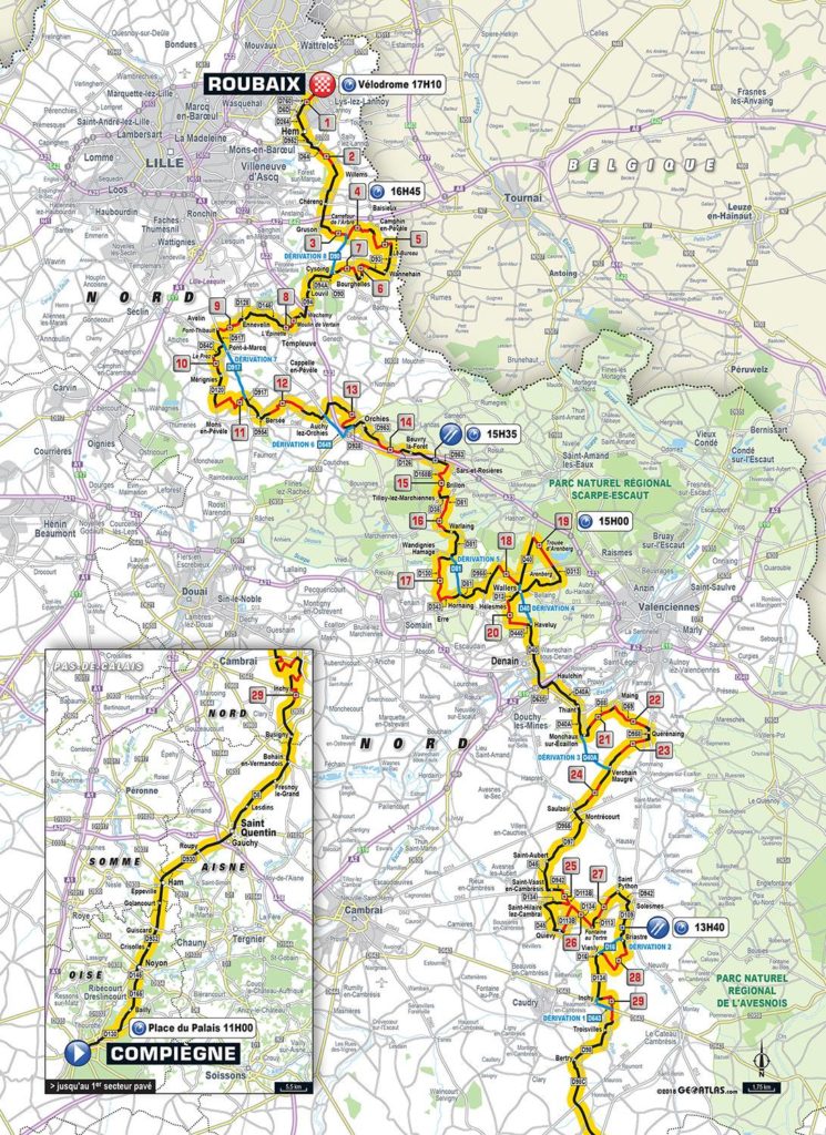 Le parcours de Paris-Roubaix 2018 reste dans la même lignée que les années précédentes même s’il y a quelques évolutions minimes (lire ici) en début de parcours mais qui ne change rien à la difficulté et à la physionomie générale du tracé selon Thierry Gouvenou. Tout commence par la première partie toute plate entre Compiègne et Troisvilles. Il n’y a pas de difficulté particulière et c’est habituellement le moment pour l’échappée matinale de se dessiner… Sauf que ces dernières années et encore plus depuis que l’épreuve est retransmise en intégralité à la TV, l’échappée a du mal à se constituer. Avec le vent de dos annoncé, l’allure devrait être très vive sur ces 90 premiers kilomètres. Sur les 20 derniers kilomètres de ce tronçon, la lutte commence à faire rage pour se positionner en vue du premier secteur.