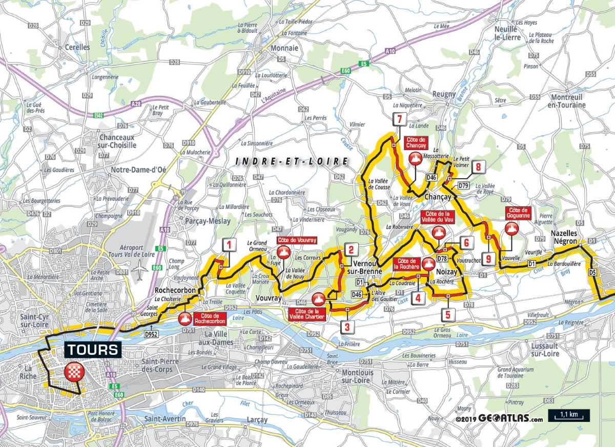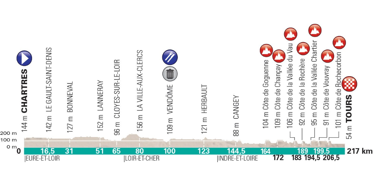Les spécialistes des classiques sont attendus ce dimanche au départ de la 113e édition de Paris-Tours. Sur les 217 kilomètres reliant Chartres à Tours, les traditionnels chemins de vigne sont conservés. Il y en aura neuf, pour un total de 10,7 kilomètres non goudronnés, répartis dans le final. Sept bosses émaillent aussi les cinquante derniers kilomètres. Il y aura donc de quoi jouer pour les costauds, avec la Côte de Goguenne (0,65km à 7,2%), la Côte de Chancay (0,75km à 6,6%), la Côte de la Vallée du Vau (1,1km à 4,5%), la Côte de la Rochère (0,4km à 8,7%), la Côte de la Vallée Chartier (0,6km à 5,7%), la Côte de Vouvray (0,5km à 5,2%) et enfin la Côte de Rochecorbon (0,8km à 4%). Tout cela empaqueté entre le km164 et le km206,5.