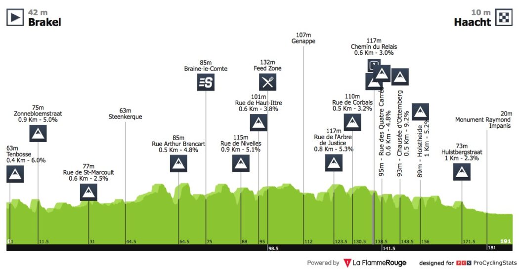 Pas de pavés mais nombre de petits monts sont au programme de l’épreuve ce samedi. L’essentiel des difficultés se trouve au cœur de la course, alors que les 20 derniers kilomètres sont plats. Avant coup, tous les scénarios semblent possibles : une échappée victorieuse, un groupe de costauds qui s’extrait dans la dernière difficulté, ou même une explication entre sprinteurs.