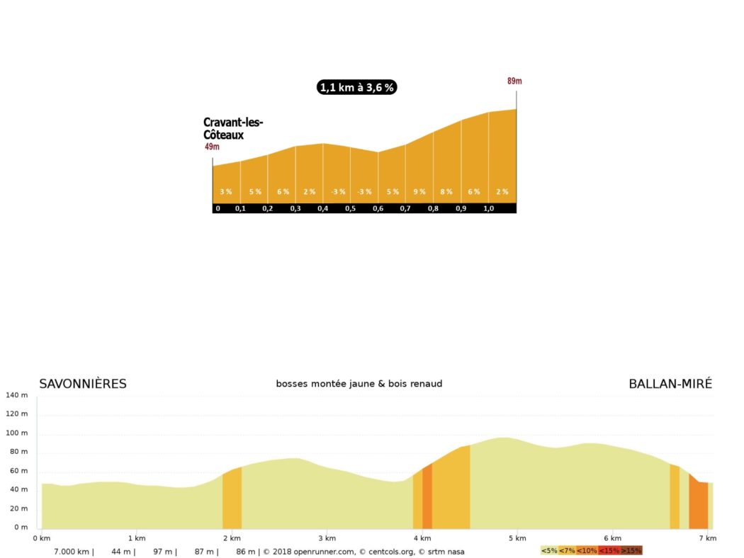 Une première difficulté testera tout de même la forme de chacun au kilomètre 37, avec une montée de 900 mètres à 7,3%. Peu après, une autre difficulté de 600 mètres à 8,7% pourrait faire mal, mais ces deux bosses sont situées trop loin de l’arrivée pour contrarier les plans des sprinteurs. Le point clé de la course sera alors la Côte des Carnaux, 700m à 5,3%, à 15 kilomètres du but. A partir de ce moment là, les équipes de sprinteurs pourront organiser l’emballage en profitant d’une route plate.