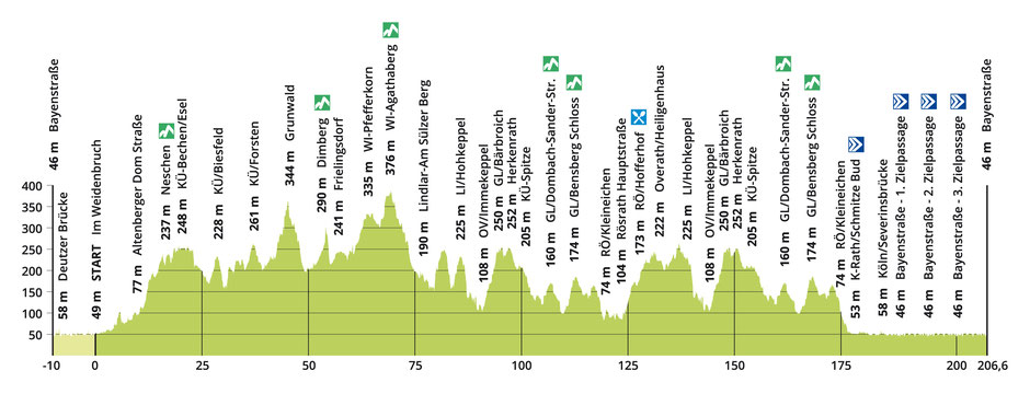 Ce dimanche se tient la 103ème édition du Tour de Cologne, l’une des plus anciennes épreuves du territoire allemand. Créée en 1908, cette course d’outre-Rhin possède le statut 1.1 au calendrier de l’Europe Tour. Si les sprinteurs ont souvent raflé la mise ces dernières saisons, l’épreuve reste toutefois assez ouverte en raison d’un parcours relativement accidenté. Tout au long des 206.6 kilomètres du parcours se dressent ainsi une dizaine de bosses, n’étant toutefois pas toutes répertoriées. Jusqu’aux vingt-cinq derniers kilomètres, la route alterne donc entre montées et descentes. Ce n’est qu’à l’issue de la dernière bosse, à 30 kilomètres de la ligne, que la route devient plate, et ce jusqu’à l’arrivée. L’opportunité donc pour les sprinteurs de revenir dans la bataille, si les puncheurs n’ont néanmoins pas creusé d’écart rédhibitoire. L’arrivée est jugée sur un circuit urbain à Cologne de près de 7 kilomètres à couvrir à trois reprises.