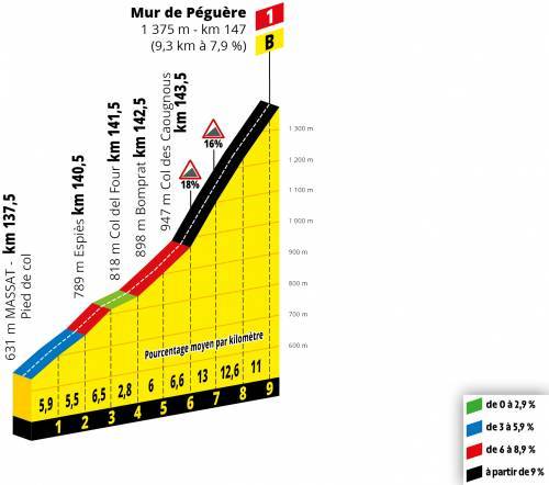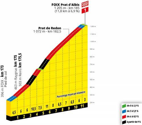 Le weekend pyrénéen se termine par une étape de 185 kilomètres entre Limoux et Foix, avec arrivée au sommet du Prat d’Albis. Outre les châteaux cathares qui borderont la route, les coureurs seront surtout concentrés sur les quatre ascensions qui les attendent. Il faudra ainsi avaler un total de 4700 mètres de dénivelé positif. La route s’élèvera peu après le départ avec la montée non répertoriée du Col des Tougnets. La Côte de Montségur (2e cat., 6,8km à 6%) attribuera les premiers points de la montagne au km60,5 en même temps qu’elle testera les jambes des coureurs après la magnifique étape de la veille. Une fois le sommet passé, le peloton évoluera sur une portion de vallée jusqu’au sprint intermédiaire de Tarascon-sur-Ariège au km93,5. Après ce point, il n’y aura plus un mètre de plat. Il faudra alors escalader trois cols de première catégorie dans les 80 derniers kilomètres. A commencer par le Port de Lers (11,4km à 7%). Le terrain idéal pour commencer à durcir la course avant l’ascension du Mur de Péguère (9,3km à 7,9%). Au sommet, 8, 5 et 2 secondes de bonification seront attribuées. De quoi inciter les leaders à se dévoiler de bonne heure. Passée la longue descente qui suit, les coureurs arriveront au pied de la montée finale : le Prat d’Albis (11,8km à 6,9%). Les 4e et 6e kilomètres d’ascension sont les plus durs avec une moyenne supérieure à 10%. La fin de la difficulté est moins exigeante, les derniers kilomètres oscillant entre 6 et 7% avant une dernière borne à « seulement » 3%. Les purs grimpeurs devront donc faire la différence avant la flamme rouge.