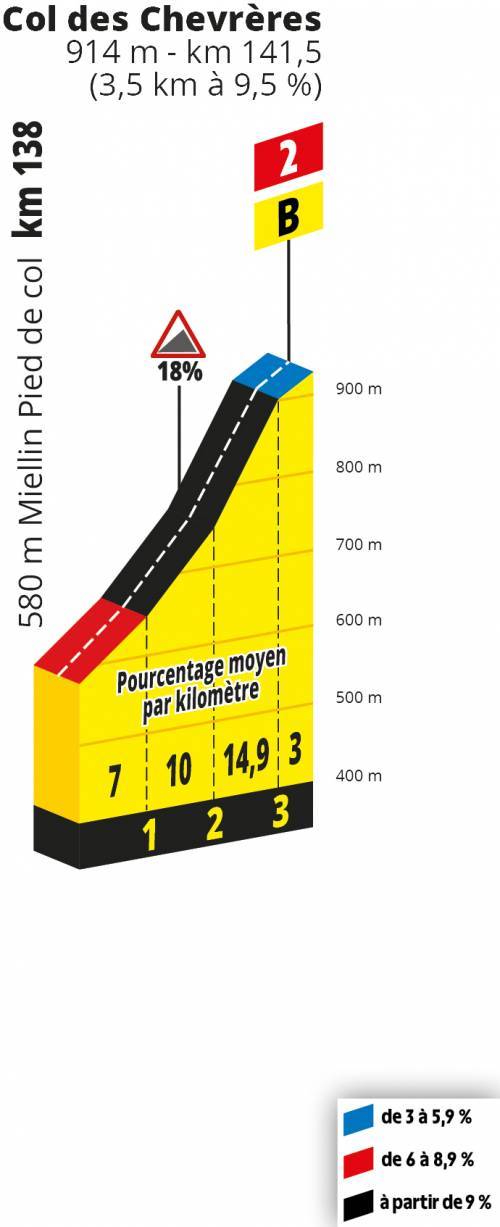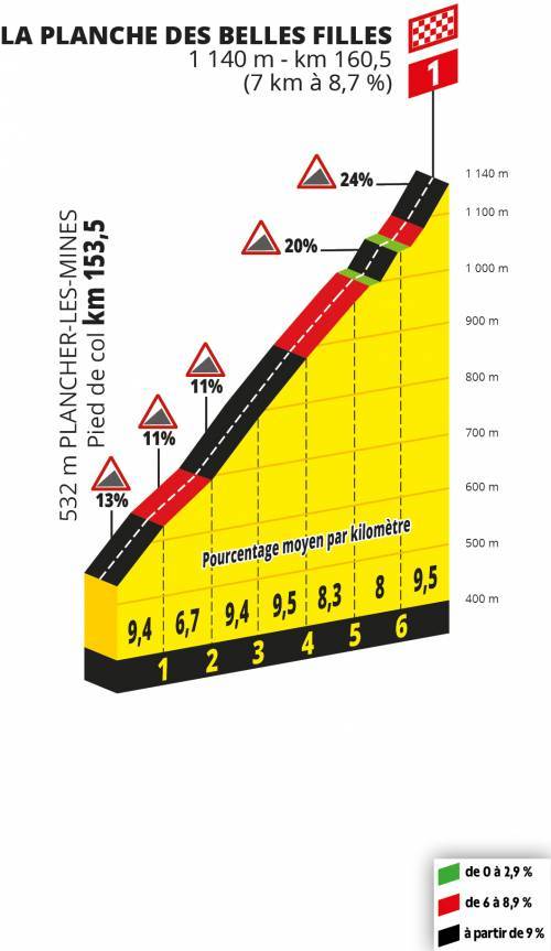Cette difficulté passée, il faudra aller chercher le Ballon d’Alsace (1ère cat., 11km à 5,8%) qui émaille au km105. Cette longue montée pourrait alors permettre à une équipe de durcir la course à l’abord du final. Il faudra ensuite escalader le Col des Croix (3e cat., 3,3km à 6,1%), puis le Col des Chevrères (2e cat., 3,5km à 9,5%). A noter que 8, 5 et 2 secondes de bonification seront attribuées aux trois premiers coureurs au sommet de cette dernière. Un sprint bonus qui pourrait avoir son importance alors que les positions sont encore assez resserrées au général. Enfin, après dix kilomètres de descente, les favoris du général devraient se présenter en tête au pied du juge de paix de cette étape : La Planche des Belles Filles (1ère cat., 7km à 8,7%). Une montée terrible allongée d’un kilomètre par rapport au dernier passage du Tour de France. Deux murs supplémentaires seront alors à négocier après la flamme rouge, tous deux à plus de 20%! Les derniers hectomètres de course sont à 24%, ce qui promet de superbes images en plus d’une intense bagarre entre candidats au maillot jaune.
