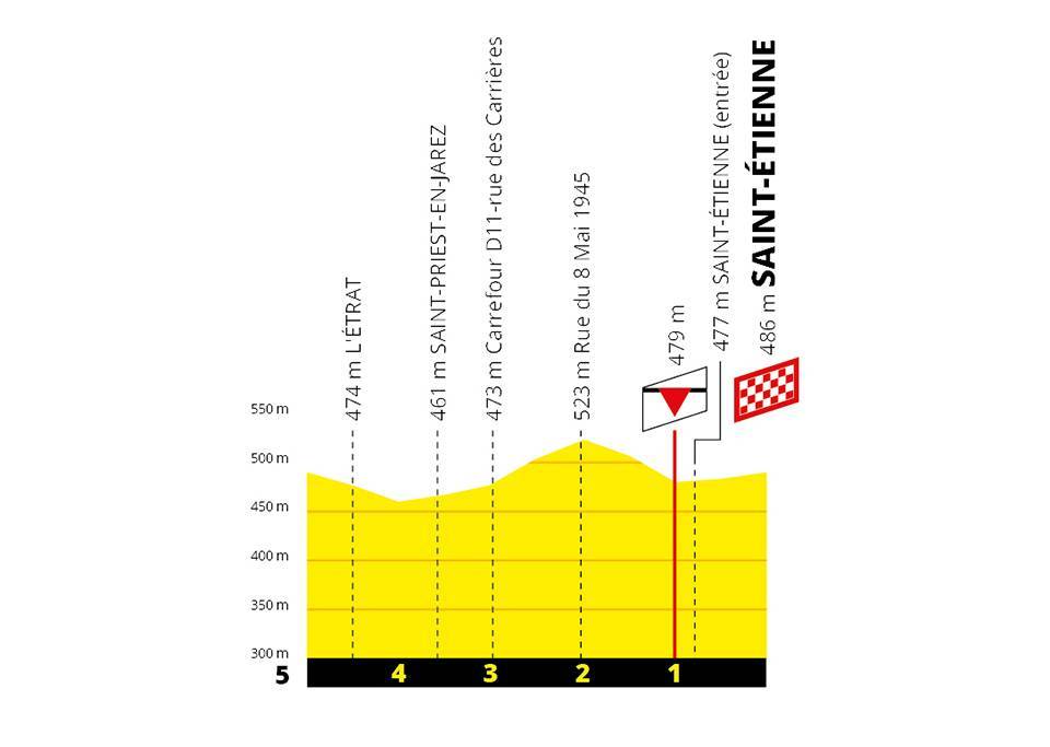 Le Tour de France se poursuit ce samedi avec un chemin de croix de 200 kilomètres entre Mâcon et Saint-Étienne. Après l’étape de transition de la veille, les coureurs trouveront un parcours jamais plat sur leur route. Il faudra ainsi avaler 3800 mètres de dénivelé, avec sept difficultés répertoriées au classement de la montagne. Si les bosses sont nombreuses sur le parcours, la première attraction du jour sera le sprint intermédiaire de Cercié-en-Beaujolais, au km33. Il est alors possible que l’échappée doive attendre le Col de la Croix Montmain (2e cat., 6,1km à 7%) pour se constituer. A partir de cette ascension, qui émaille au km45, les coureurs ne feront que monter et descendre. Il faudra ensuite négocier le Col de la Croix de Thel (2e cat., 4,1km à 8,1%), puis le Col de la Croix Paquet (2e cat., 2,1km à 9,7%) avant la Côte d’Affoux (3e cat., 8,5km à 4,5%). Ces trois difficultés sont réparties sur seulement 25 kilomètres et promettent de mettre à rude épreuve les coureurs fatigués. Les réjouissances ne s’arrêteront pas là pour autant puisqu’après un court répit, il faudra avaler la Côte de la Croix de Part (2e cat., 4,9km à 7,9%), puis la Côte d’Aveize (2e cat., 5,2km à 6,4%). Là, les coureurs arriveront dans un final accidenté avec en point d’orgue la Côte de la Jaillière (3e cat., 1,9km à 7,9%). 8, 5 et 2 secondes de bonification seront attribuées aux trois premiers au sommet, qui est placé à 12,5 kilomètres de l’arrivée. Un tremplin idéal pour Julian Alaphilippe (Deceuninck-Quick Step), à qui il ne manque que six secondes pour récupérer le maillot jaune.