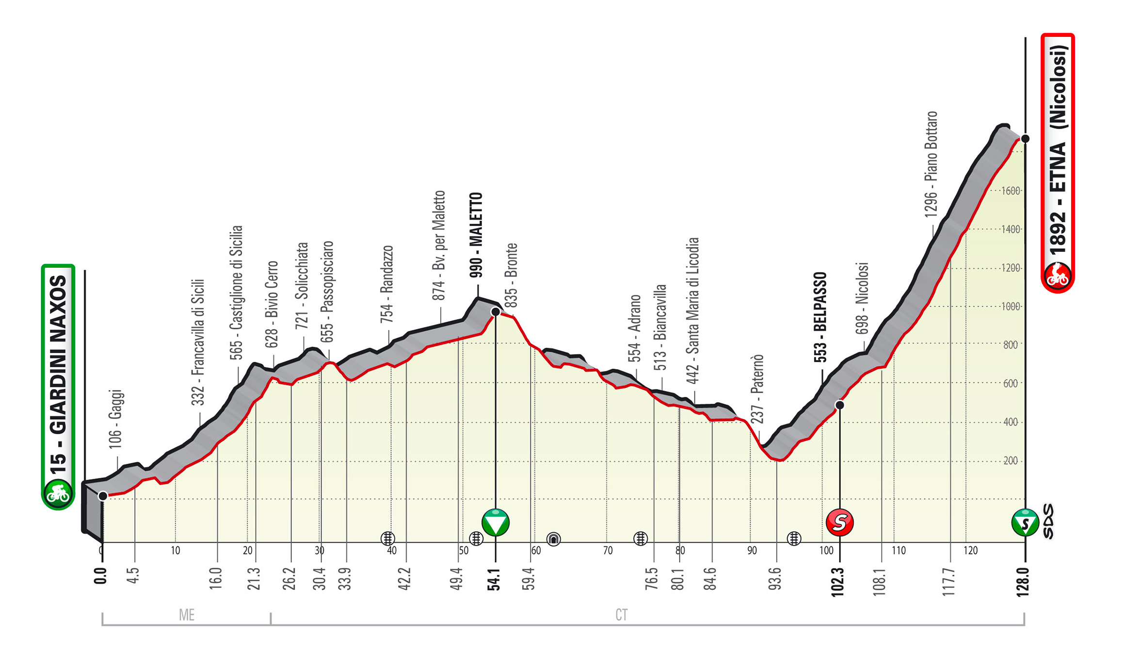 Vendredi, les choses sérieuses commencent à Caltanissetta pour la troisième étape. 188 kilomètres sont à couvrir pour atteindre Raguse et un final dédié aux puncheurs-grimpeurs. Avant la bosse finale, il faudra s’acquitter d’une route jamais plate et, surtout, monter la Serra di Burgio à 21 unités de la ligne. Ce final exigeant promet de dessiner un avant-goût du général, avant de terminer l’épreuve en beauté, au sommet de l’Etna. Ce samedi, la dernière étape propose deux ascensions majeures : Maletto, au km 54, et donc, l’arrivée au sommet de l’Etna, à 1892 mètres au-dessus du niveau de la mer. Un grimpeur devrait alors profiter des pentes du volcan sicilien pour faire la différence et aller remporter le classement général.