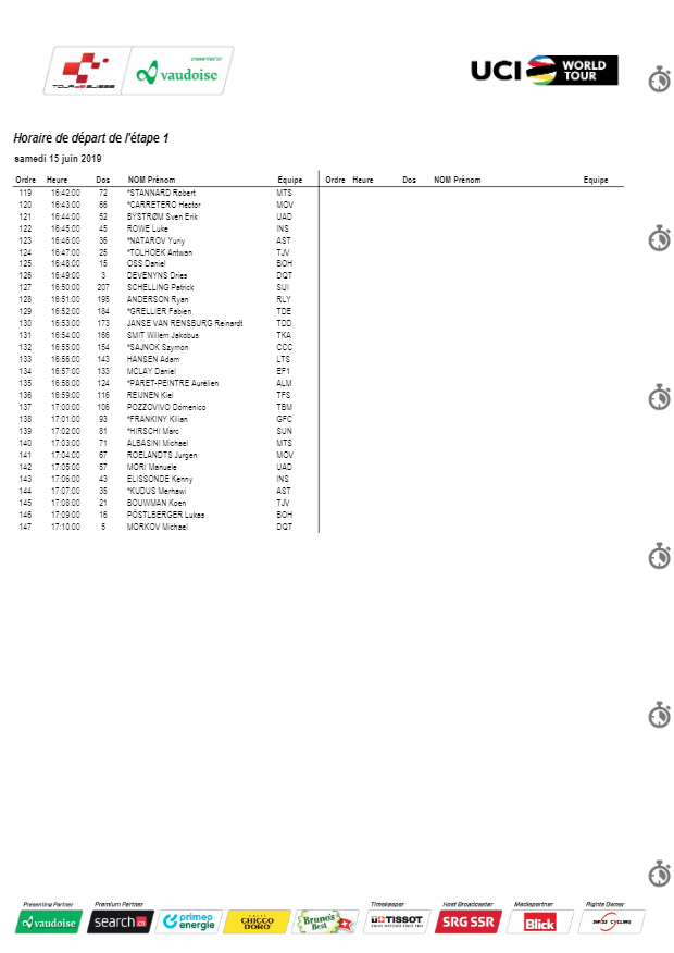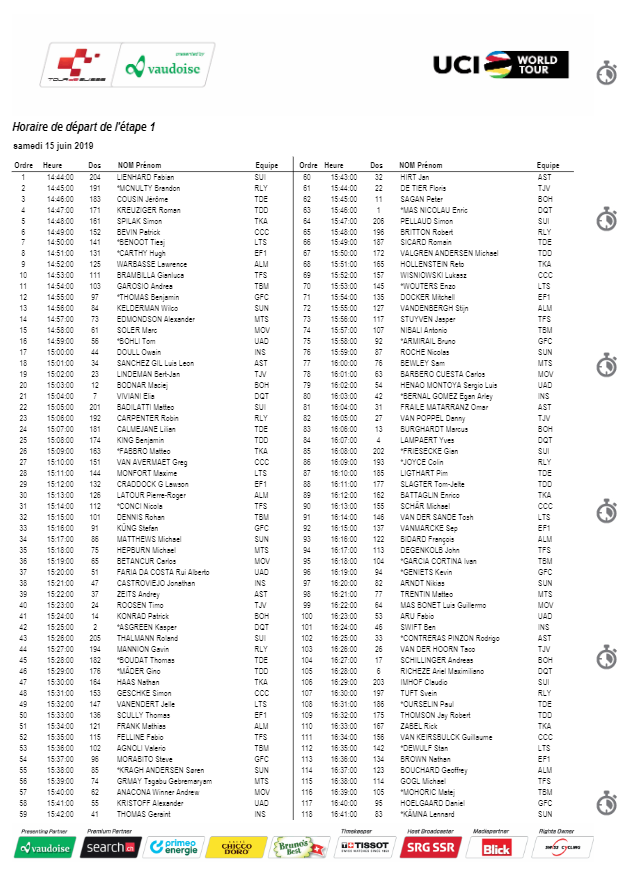 Ce sera donc un spécialiste de l’exercice qui s’imposera dans cette effort, trop long pour être un prologue, mais très court pour un contre-la-montre. Il faudra alors surveiller des coureurs comme Patrick Bevin (CCC Team), Rohan Dennis (Bahrain-Merida) ou Stefan Kung (Groupama-FDJ), mais également Yves Lampaert (Deceuninck-Quickstep) ou Michael Matthews (Team Sunweb). Chez les favoris, c’est une bonne occasion pour Geraint Thomas de creuser des premiers écarts, lui qui affectionne ce format. A noter également que la pluie devrait être présente en fin d’après-midi, raison pour laquelle la plupart des favoris ont fait le choix de partir dans les premières positions.