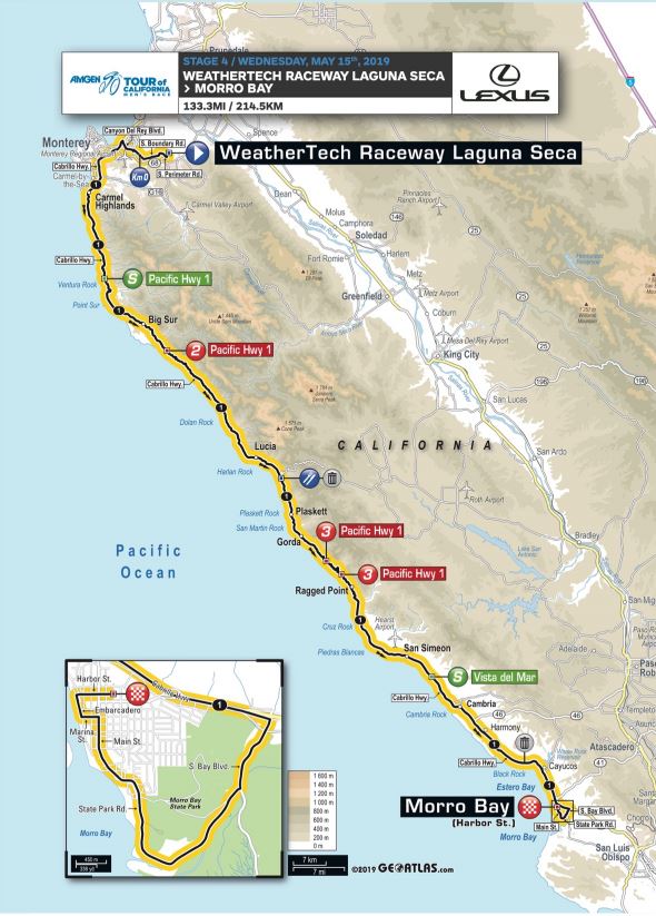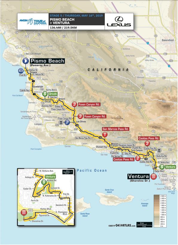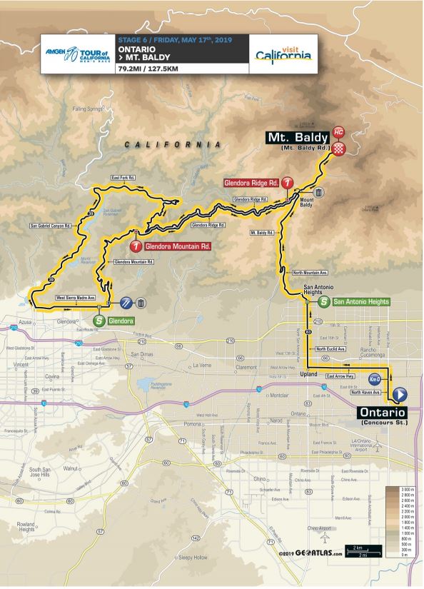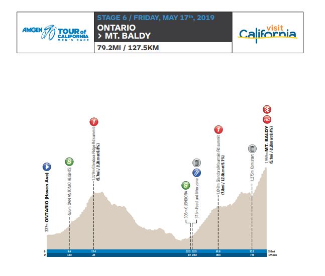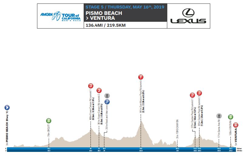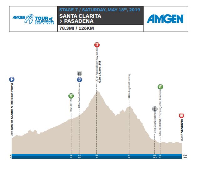 La troisième étape est moins exigeante, mais propose tout de même l’ascension du Mont Hamilton (7km à 8,7%) à la mi-course. Cinq autres difficultés sont répertoriées, la dernière d’entre elles étant située à 50 kilomètres de la ligne. Un parcours idéal pour un groupe de baroudeurs, avant une deuxième journée dédiée aux sprinteurs. Après ce qui devrait être la dernière opportunité d’emballage final, la cinquième étape propose à nouveau cinq difficultés, dont l’ascension du San Marcos Pass (5,9km à 6,8%) et deux montées consécutives du Casitas Pass (4km à 5,5%). La dernière bosse émaille à 30 kilomètres du but et pourrait permettre à un costaud de faire la bascule dans la descente. Une victoire de l’échappée n’est pas non plus à exclure, avant deux dernières journées consacrées à la lutte pour le général. L’étape reine se tiendra vendredi avec trois ascensions majeures : Glendora Ridge (9,2km à 6,8%), Glendora Mountain (12,6km à 5,1%) et la montée finale du Mont Baldy (8,2km à 8,4%), qui culmine à 1959 mètres d’altitude. Soit 3000 mètres de dénivelé répartis en seulement 127 kilomètres. Enfin, la dernière étape présente un profil en deux parties : les coureurs s’élanceront de Santa Clarita, à 300 mètres au-dessus de la mer, pour aller jusqu’à 1471 mètres d’altitude à la mi-parcours, avant de redescendre jusqu’à l’arrivée de Pasadena, à 249 mètres.