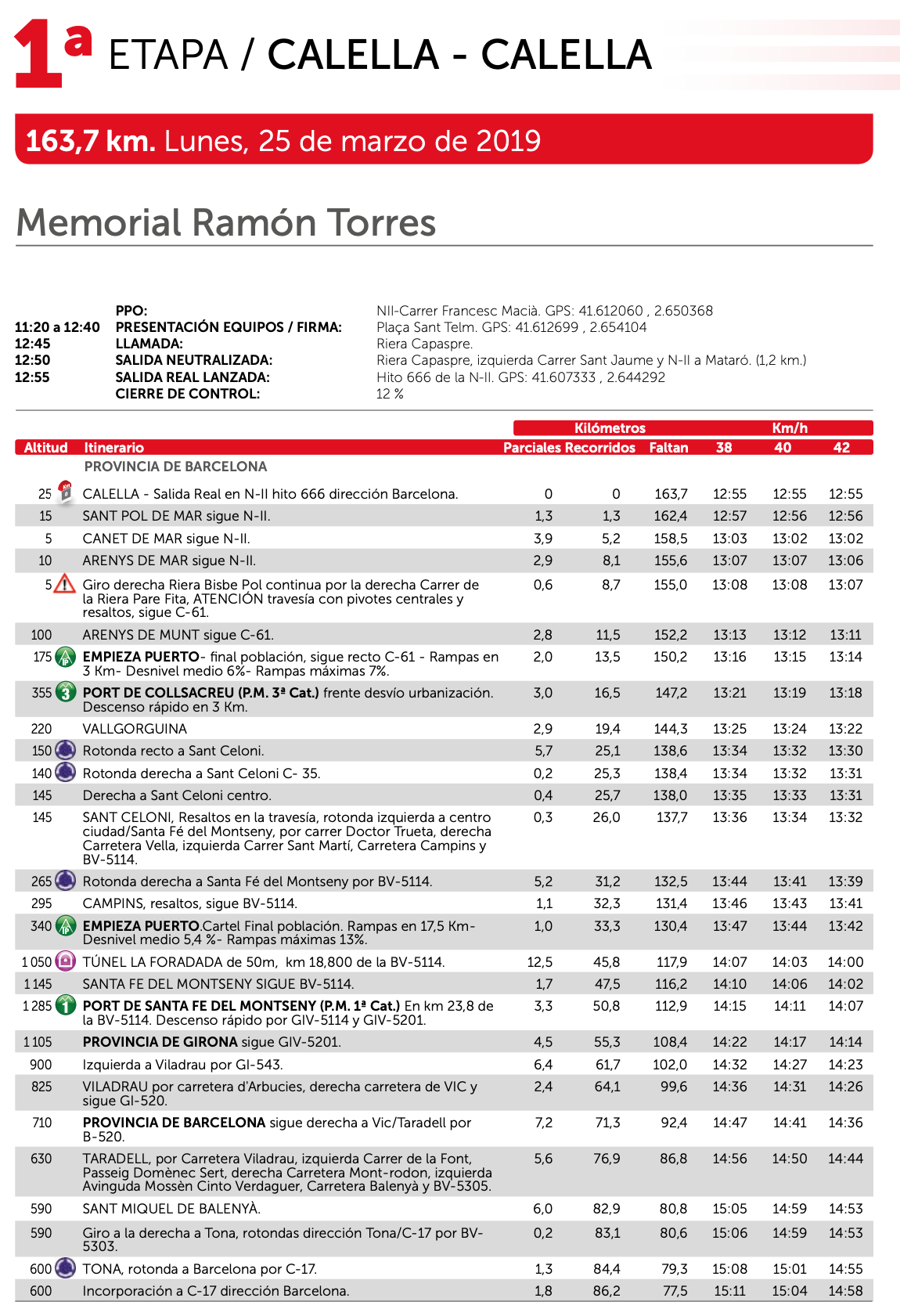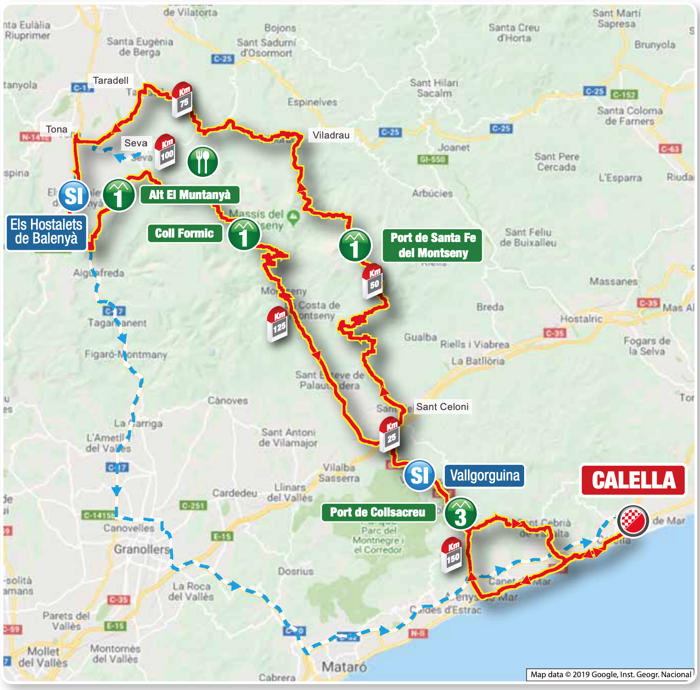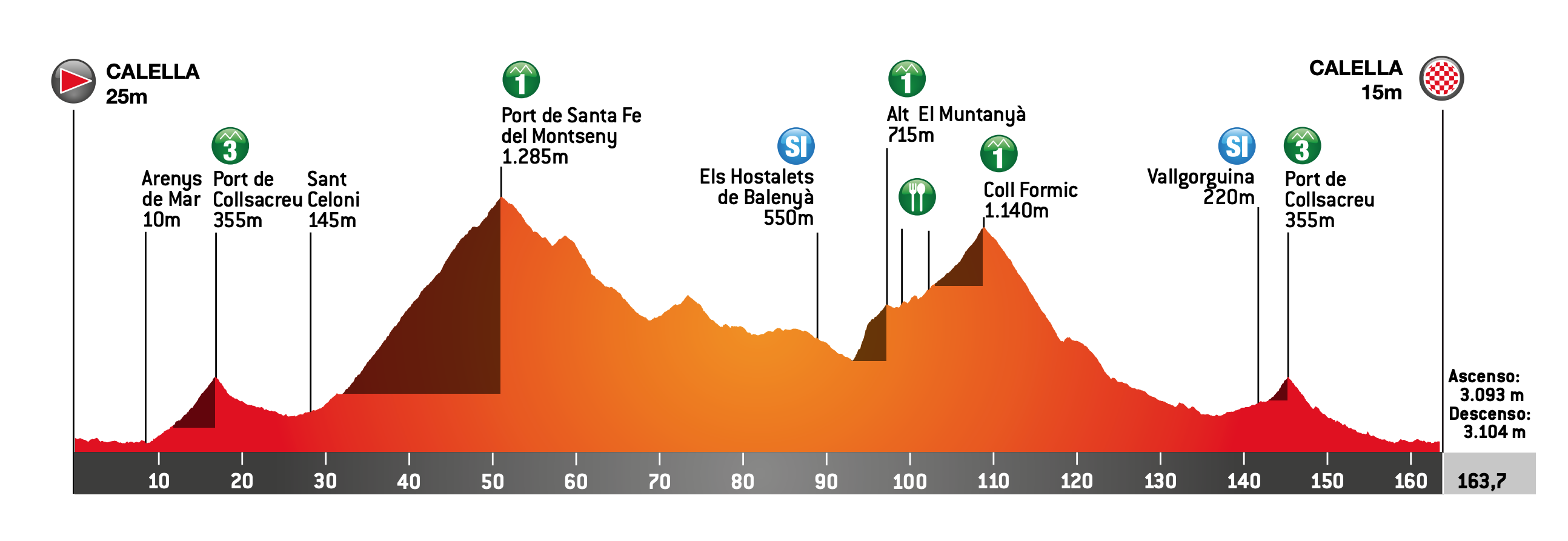 Une première étape vallonnée pour entrer directement dans le vif du sujet. Cinq difficultés sont répertoriées au classement de la montagne sur le parcours de ce lundi. Avec notamment le Port de Santa Fe del Montseny (18,5km à 5,4%), une ascension longue qui mènera les coureurs de 300 à 1300 mètres d’altitude. Cependant, cette dernière est située à plus de 100 kilomètres de l’arrivée et devrait permettre le retour des sprinteurs dans le peloton. Il faudra alors passer le Coll Formic (7,3km à 5%) et le Parc de Collsacreu (1,6km à 5,3%), à 19 unités du but, pour disputer l’emballage à Calella.